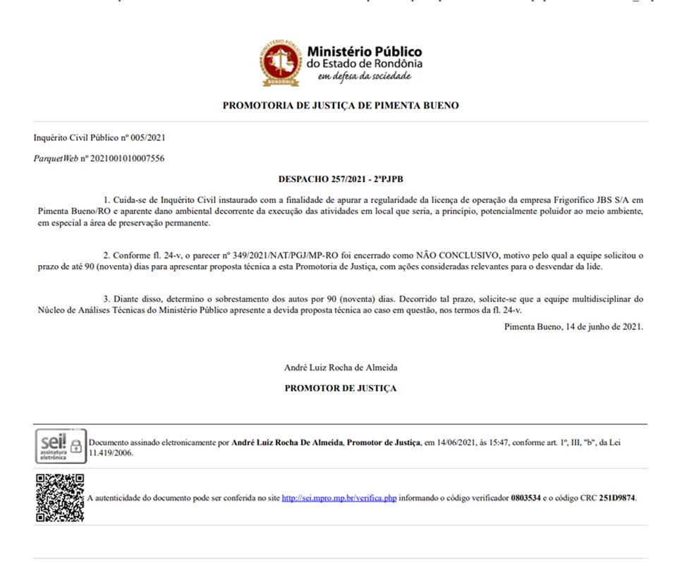 Porto Velho, RO – Em junho deste ano o promotor de Justiça André Luiz Rocha de Almeida, da 2ª Promotoria de Justiça de Pimenta Bueno, mandou sobrestar os autos de inquérito que investiga a JBS em Rondônia.