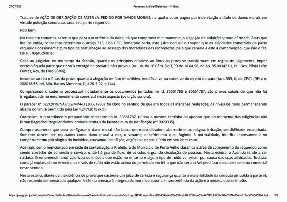 O cidadão alegou na Justiça, resumidamente, que desde a inauguração do empreendimento “a sua vida ficou insuportável em decorrência do barulho constante advindos do fundo do estabelecimento”.