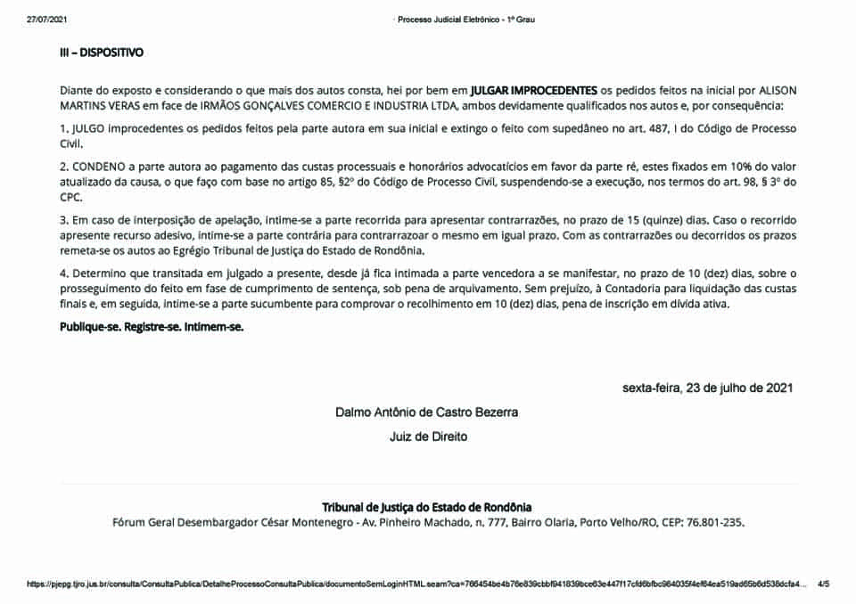 Porto Velho, RO – O juiz de Direito Dalmo Antônio de Castro Bezerra julgou improcedente ação movida por um morador do Condomínio Rio Bonito, situado à Av. Jatuarana, algo em torno de 30 metros do mercado Irmãos Gonçalves.