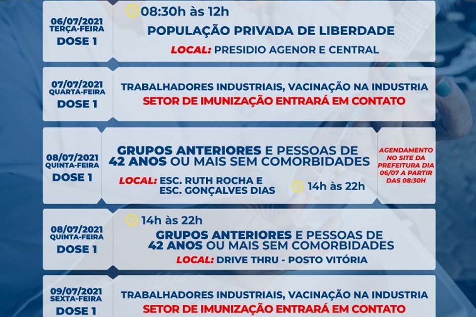 Confira abaixo o cronograma de vacinação para esta semana em Ji-Paraná. As informações foram disponibilizdas pela prefeitura do mnicípio. Vale ressaltar que pessoas de 42 anos ou mais SEM comorbidades serão vacinadas nesta próxima quinta-feira (8). Para fazer agendamento, segue o link do site da prefeitura: http://www.site.ji-parana.ro.gov.br/