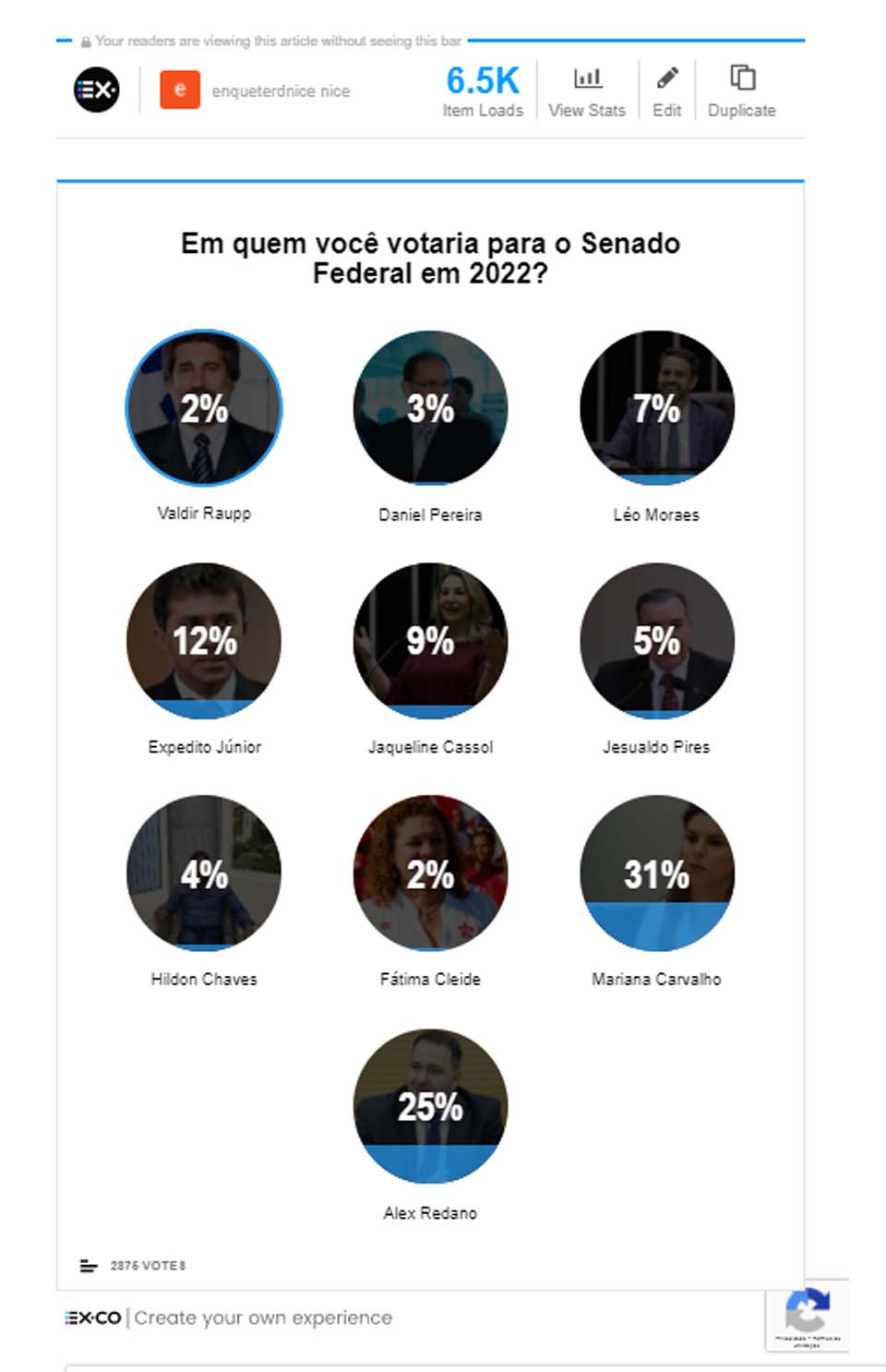 Porto Velho, RO – Na última sexta-feira, dia 23, o jornal eletrônico Rondônia Dinâmica lançou enquete para saber dos seus leitores e leitoras as preferências para o Senado Federal nas eleições do próximo ano.