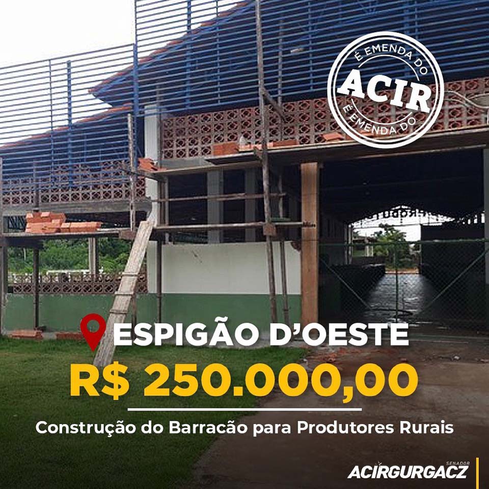 Espigão do Oeste ;RO - O Senador Acir Gurgacz (PDT-RO), em rede social, nesta terca-feira (6), anunciou a destinação de R$ 250 mil em recursos, por meio de emenda parlamentar, para o construção do Mercado Municipal em Espigão do Oeste. De acordo com o parlamentar, a obra irá impulsionar a agricultura familiar da região, trazendo melhorias e vários benefícios aos produtores rurais e moradores do município.