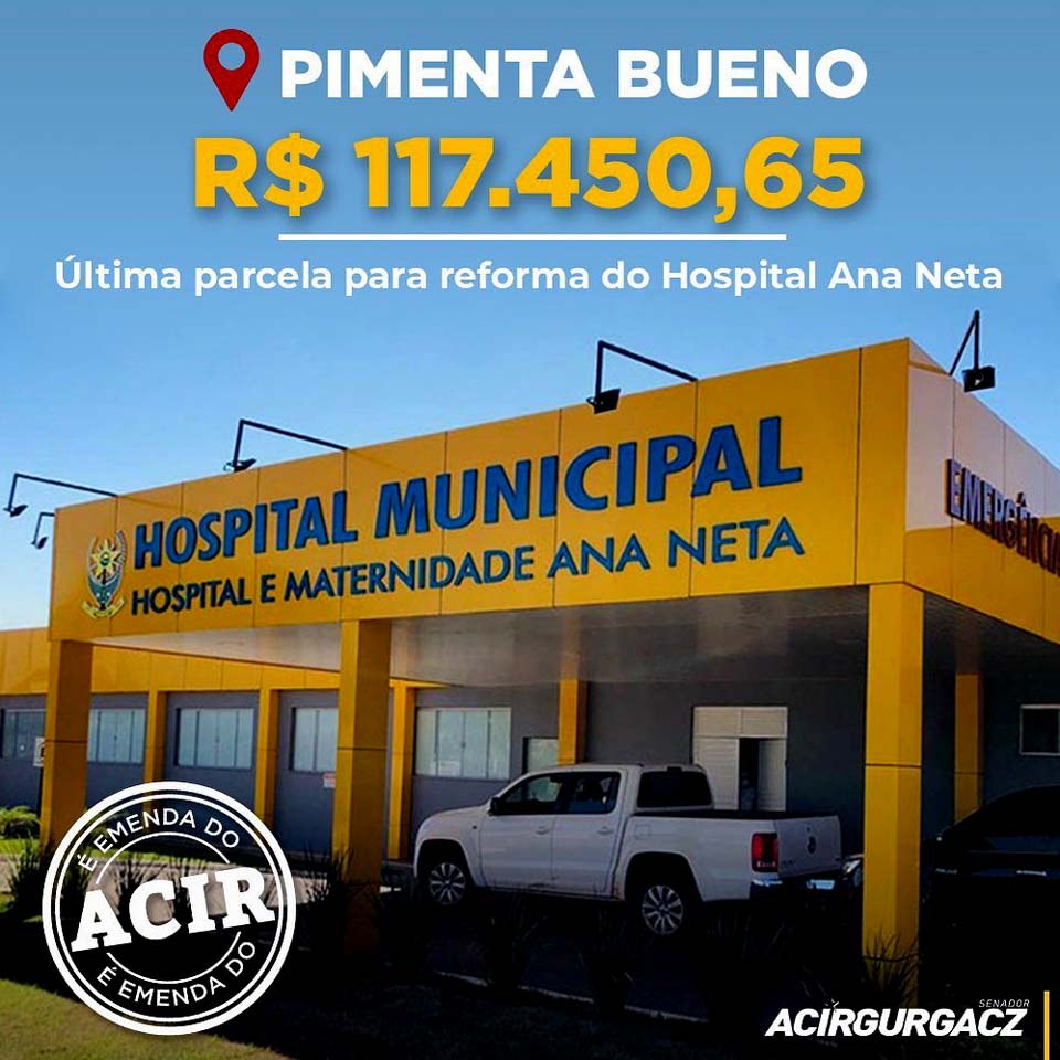 "Oriunda de emenda orçamentária de minha autoria, já está disponível na conta da prefeitura de Pimenta Bueno para conclusão da reforma do Hospital e Maternidade Ana Neta. A destinação desses recursos é importante, para que o sistema de saúde do município continue atendendo bem a toda população", informou Acir Gurgacz.