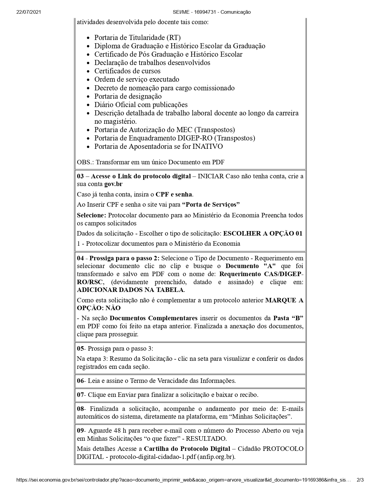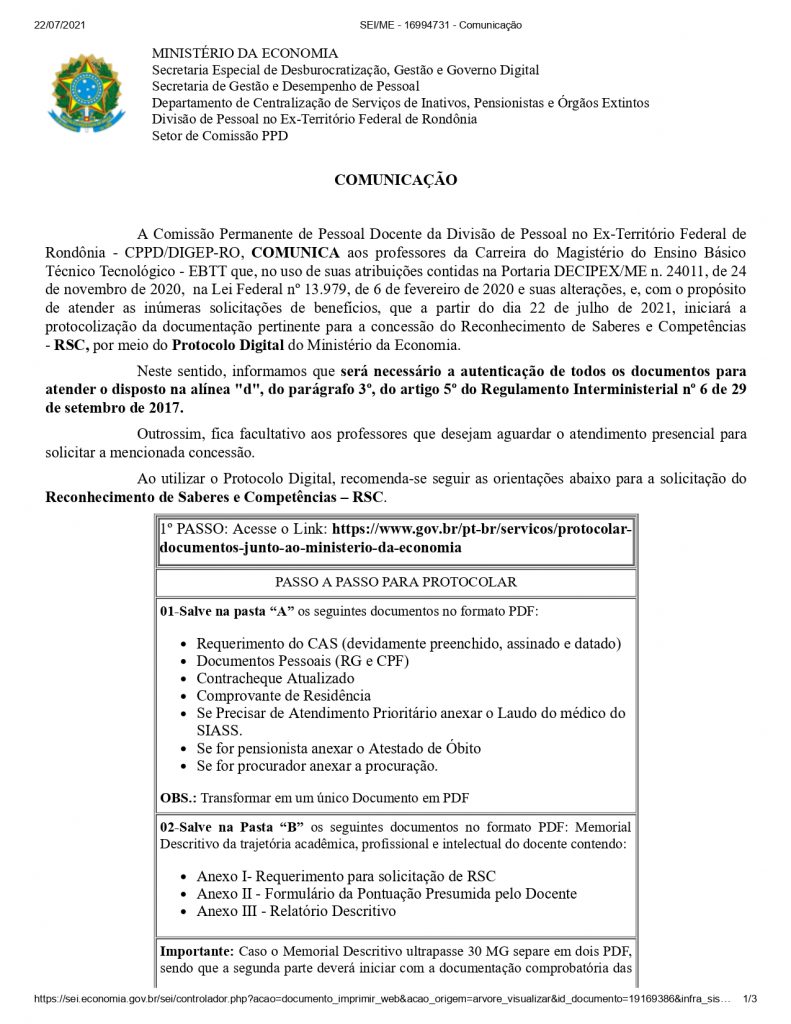 Para protocolar é necessário que a documentação esteja autenticada através de cartório e que as declarações sejam encaminhadas com vias originais. Podem requerer a RSC, professores enquadrados na Carreira do Magistério do Ensino Básico Técnico e Tecnológico-EBTT.