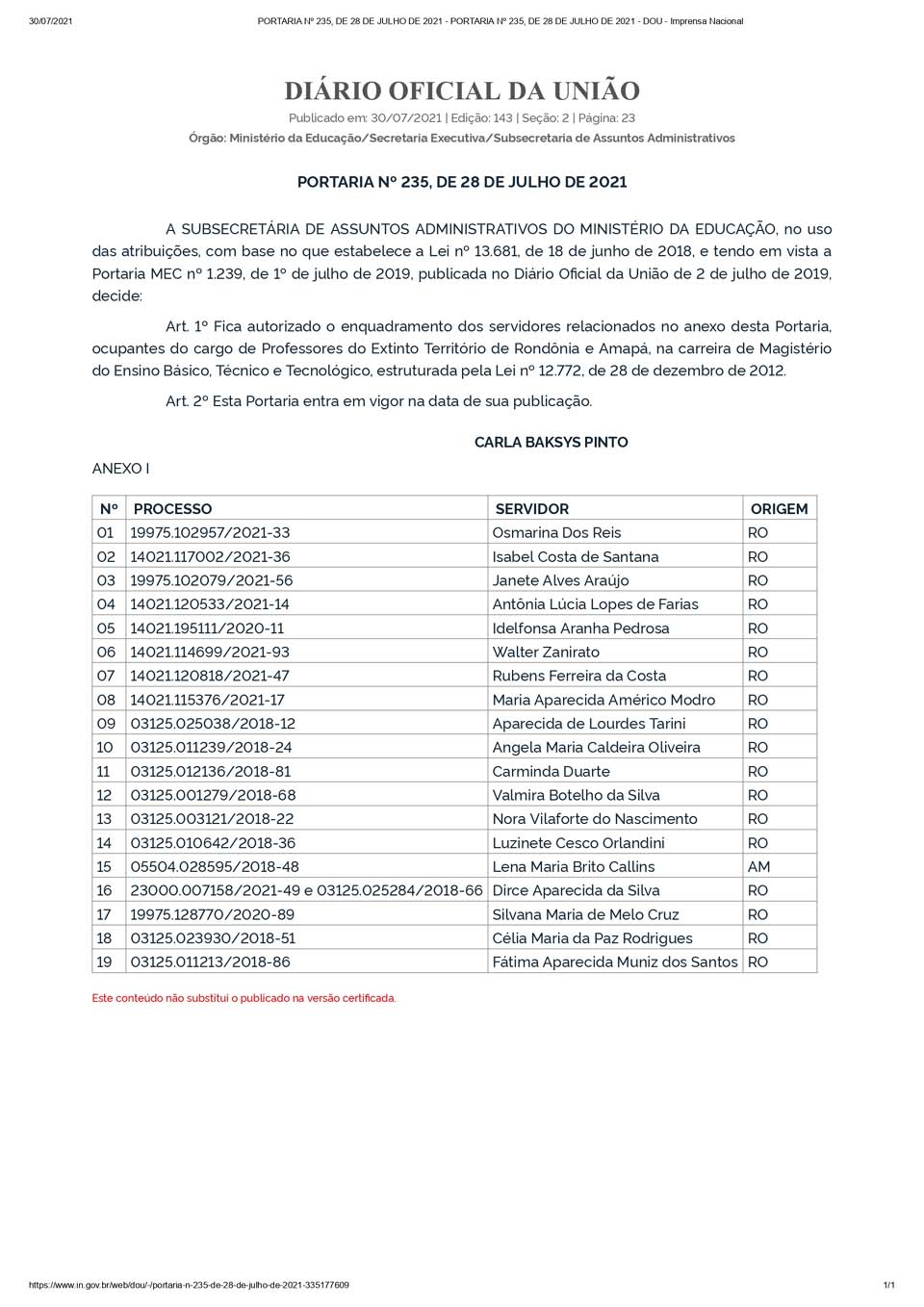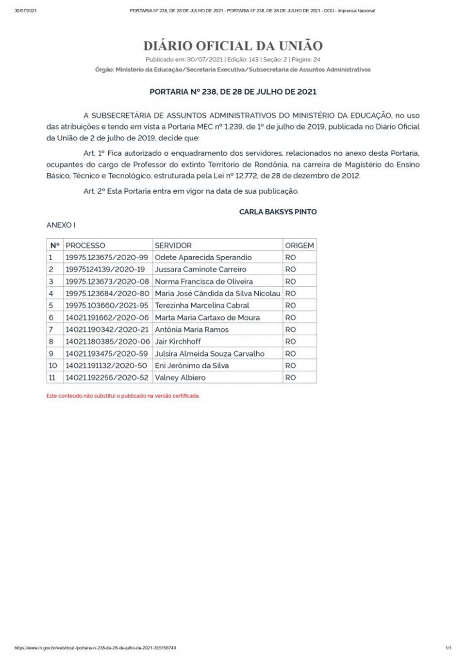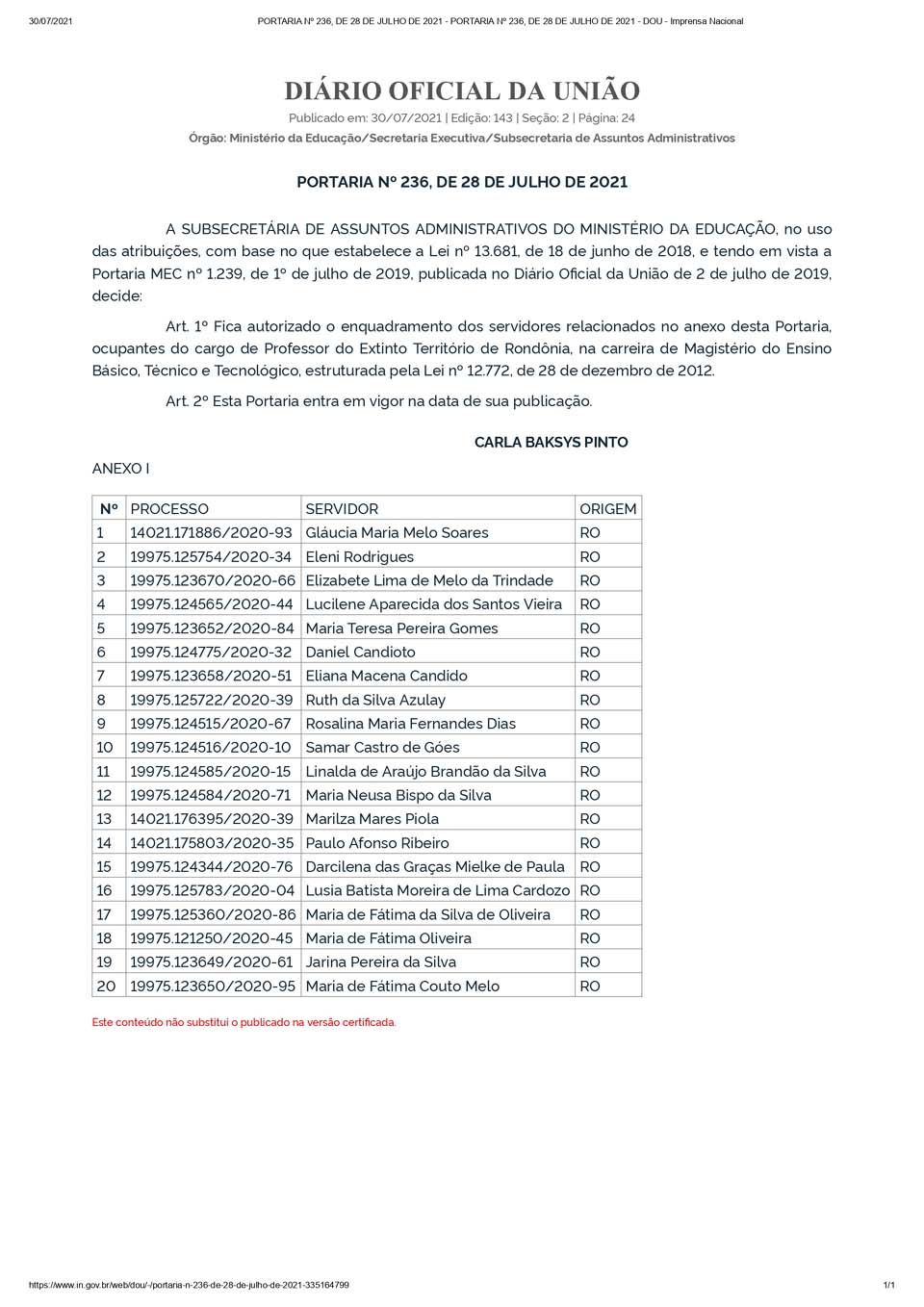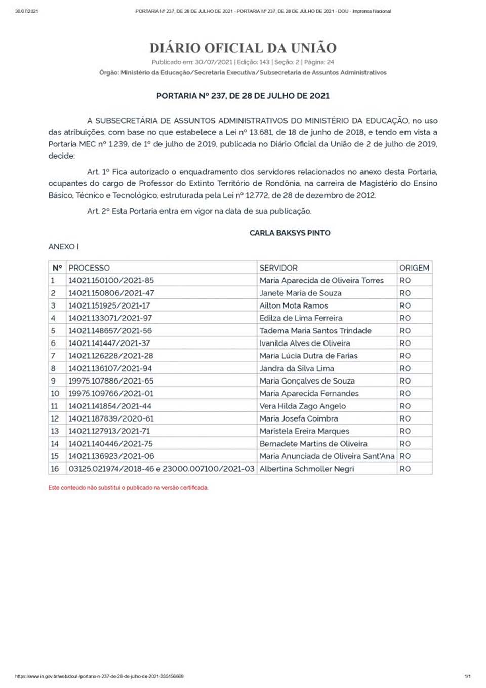 O Sindicato dos Servidores Públicos Federais no Estado de Rondônia – Sindsef/RO informa aos professores do ex-Território de Rondônia, o Ministério da Educação divulgou no Diário Oficial da União desta sexta-feira, 30 de julho, portarias de enquadramento de professores do Extinto Território de Rondônia, na carreira de Magistério do Ensino Básico, Técnico e Tecnológico, estruturada pela Lei nº 12.772, de 28 de dezembro de 2012.