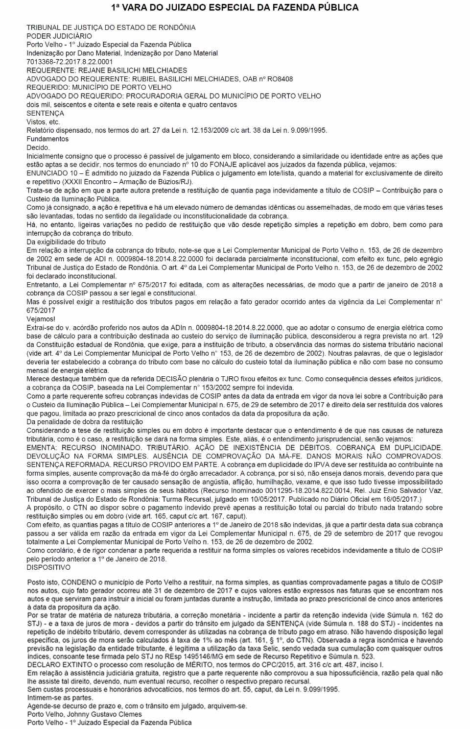 Na semana passada, a 1ª. Vara do Juizado Especial julgou procedente uma dessas ações de ressarcimento no processo 7013368-72.2017.8.22.0001 (Indenização por Dano Material, Indenização por Dano Material) a uma consumidora de Porto Velho. Na decisão, o juízo assevera o erro da legislação que dotou o consumo de energia elétrica como base de cálculo para a COSIP ignorando a regra prevista no art. 129 da Constituição estadual de Rondônia, que exige, para a instituição de tributo, a observância das normas do sistema tributário nacional.