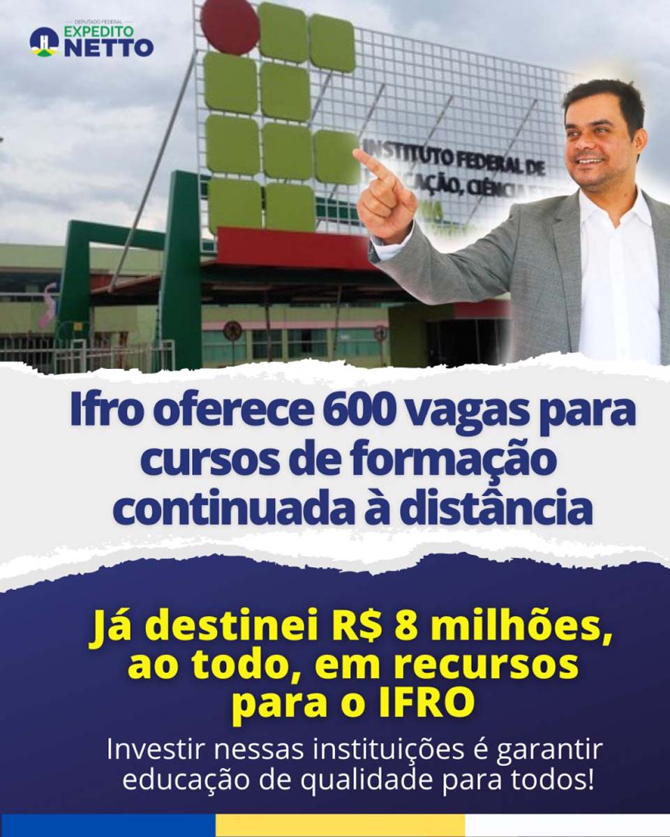 "Já destinei R$ 8 milhões em emendas para o IFRO e ver os resultados desse trabalho é extremamente gratificante. Por isso, estou aqui para divulgar as ações da instituição. Estão abertas as inscrições, gratuitamente, até sexta-feira, de 600 vagas para cursos de formação continuada em formato de Educação à Distância (EaD). As aulas são ofertadas pelo campus Calama, em Porto Velho", informou o parlamentar.