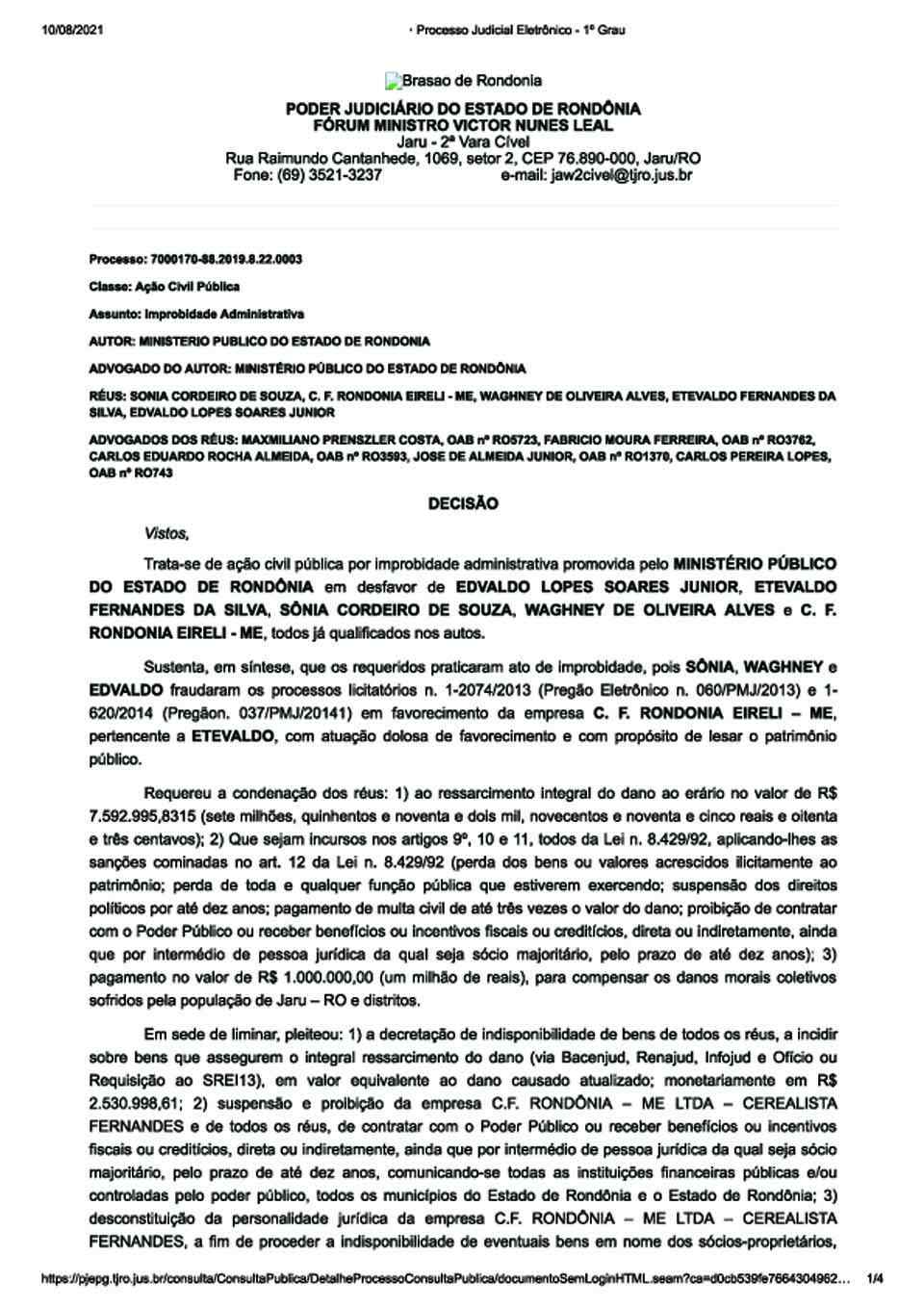 Aos envolvidos, que terão direito ao contraditório e ampla defesa, o MP/RO também pede condenação ao “pagamento de multa civil de até três vezes o valor do dano; proibição de contratar com o Poder Público ou receber benefícios ou incentivos fiscais ou creditícios, direta ou indiretamente, ainda que por intermédio de pessoa jurídica da qual seja sócio majoritário, pelo prazo de até dez anos)”.