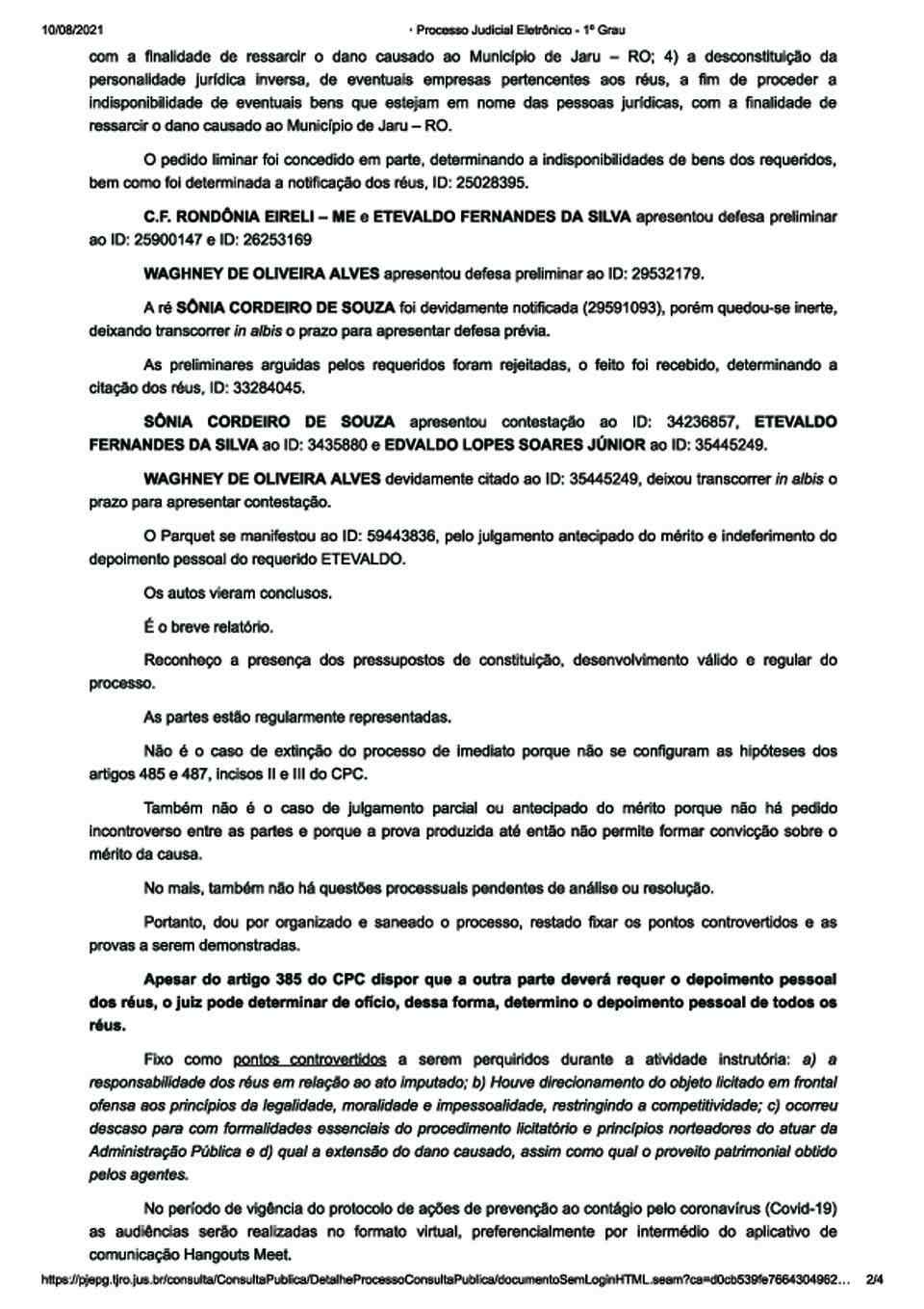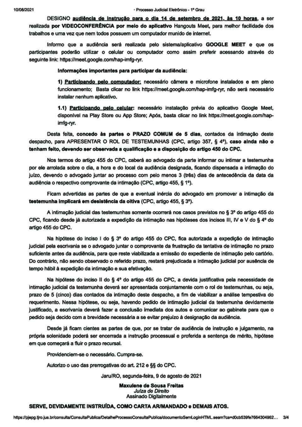 “DESIGNO audiência de instrução para o dia 14 de setembro de 2021, às 10 horas, a ser realizada por VIDEOCONFERÊNCIA por meio do aplicativo Hangouts Meet, para melhor facilidade dos trabalhos e uma vez que nem todos possuem um computador munido de internet”, concluiu.
