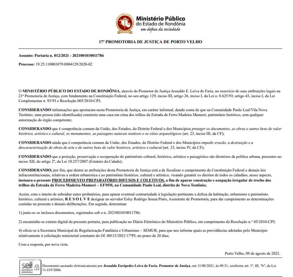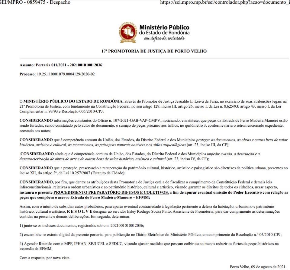 Porto Velho, RO – O Ministério Público de Rondônia (MP/RO), através da 17ª Promotoria de Justiça de Porto Velho, abriu dois procedimentos distintos para investigar questões relacionadas à Estrada de Ferro Madeira-Mamoré (EFMM).