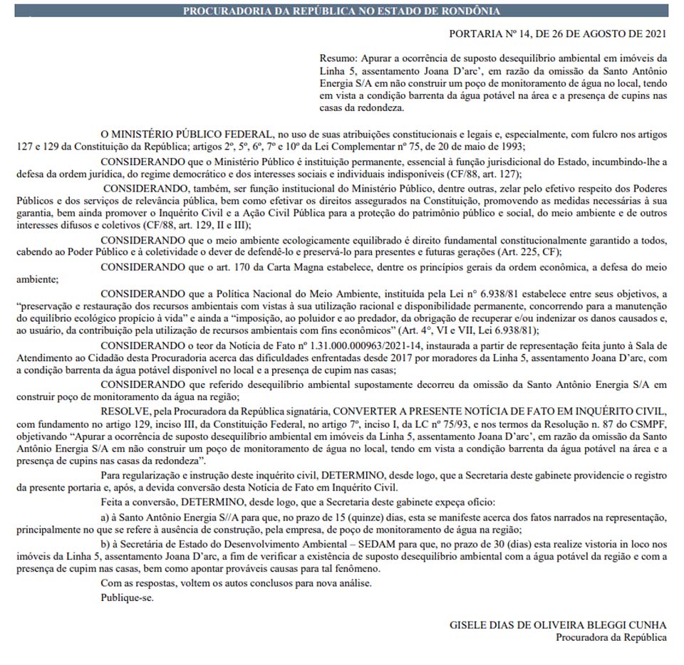 O MPF/RO considera ainda que o aventado desequilíbrio ambiental “supostamente decorreu da omissão da Santo Antônio Energia S/A em construir poço de monitoramento da água na região”.