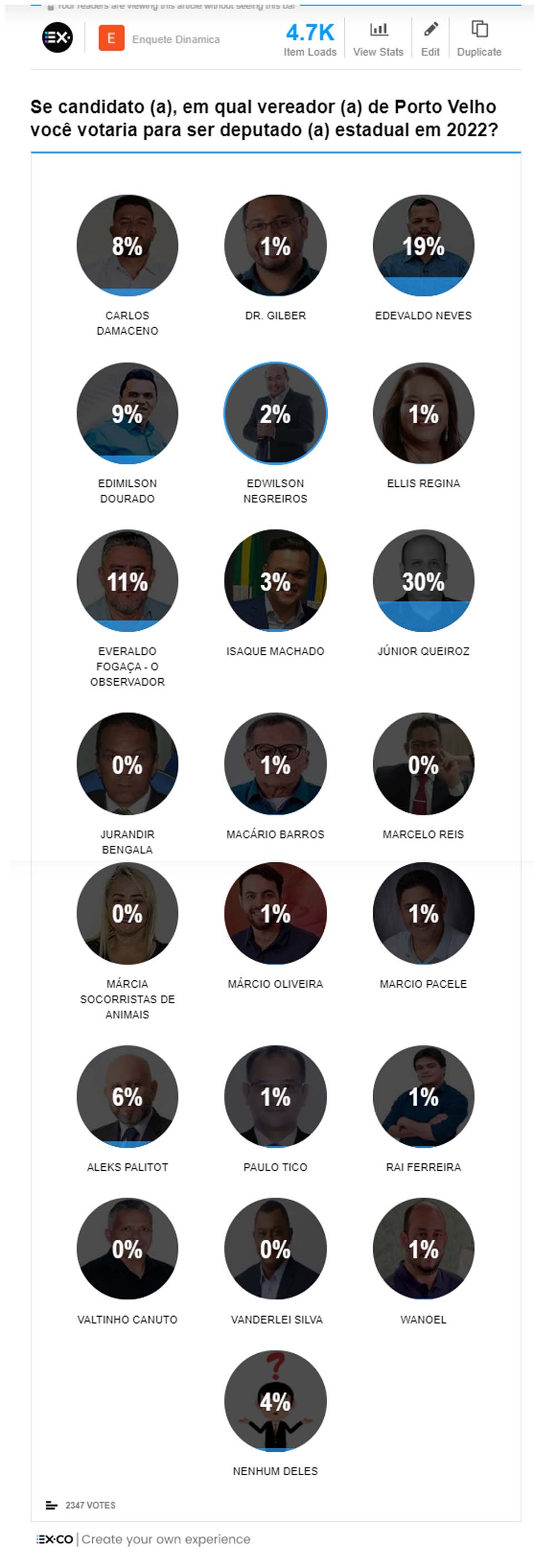 Porto Velho, RO – Na última sexta-feira (27), o jornal eletrônico Rondônia Dinâmica lançou enquete para saber dos seus leitores e leitoras quem dentre vinte e um nomes entre os atuais membros da Câmara Municipal de Porto Velho teria maiores condições de ser deputado (a) estadual em 2022.