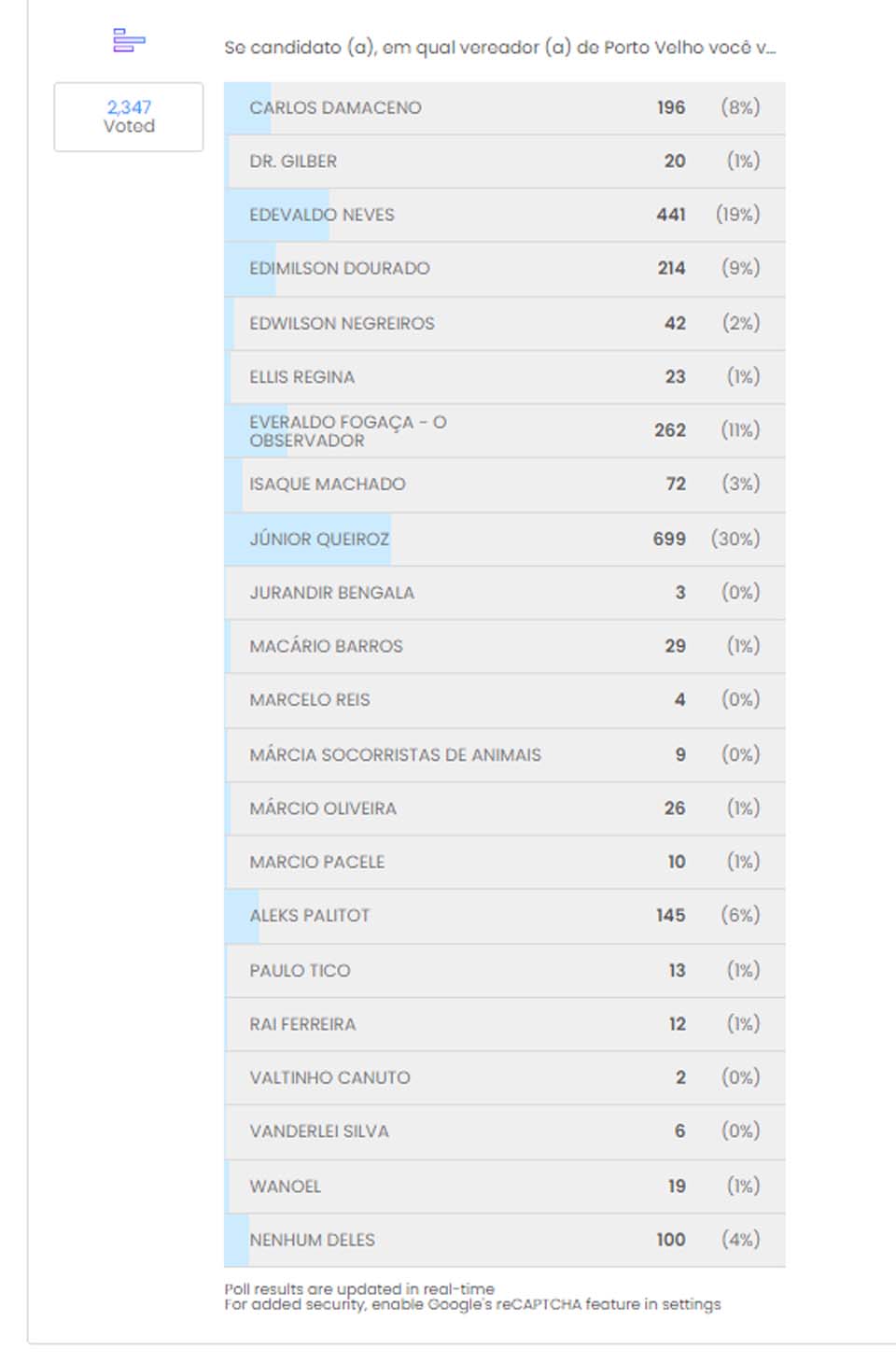 A primeira opção com mais votos foi o nome de Júnior Queiroz, com 699 votos, alcançando 30% do total. Em seguida vieram, na ordem: 02) Edevaldo Neves, com 447 votos e 19%; 03) Everaldo Fogaça, com 262 votos e 11%; 04) Edimilson Dourado, com 214 votos e 9%; e 05) Carlos Damaceno, com 196 votos e 8%.