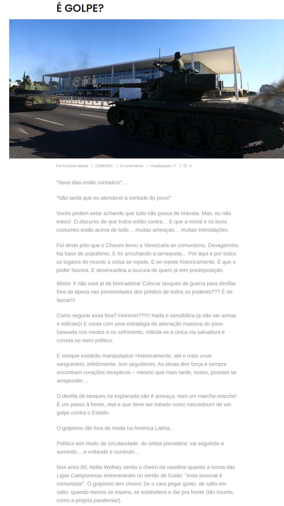 “O desfile de tanques na esplanada não é ameaça, nem um marche-marche! É um passo à frente, real e que deve ser tratado como nascedouro de um golpe contra o Estado. O golpismo tão fora de moda na América Latina…”.
