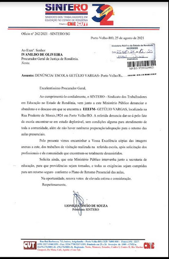O Sintero protocolou denúncia ao Ministério Público do Estado de Rondônia (MP/RO), nesta quarta-feira (25/08), relatando que a E.E.E.F.M Getúlio Vargas, localizada em Porto Velho, encontra-se em condições inadequadas para receber toda a comunidade escolar, tendo em vista os parâmetros estabelecidos no Plano de Retorno Presencial elaborado pela Secretaria de Estado de Educação (Seduc).