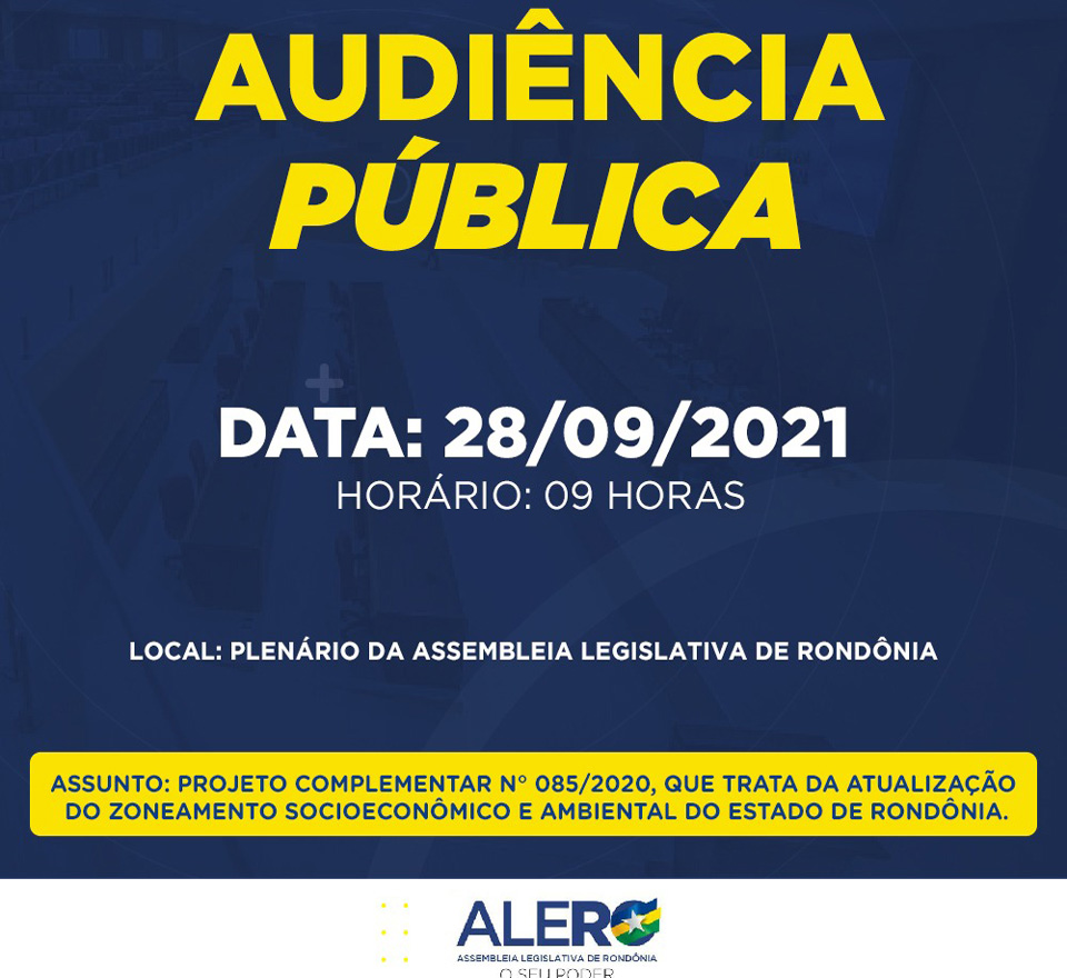 A Assembleia Legislativa de Rondônia promove na próxima terça-feira, 28 de setembro, às 9h, em seu plenário, audiência pública para debater sobre a proposta original e emendas parlamentares relacionadas ao projeto de Lei Complementar nº 085/2020, que tramita na Casa e trata da atualização do zoneamento socioeconômico e ambiental do Estado de Rondônia.