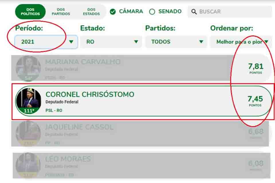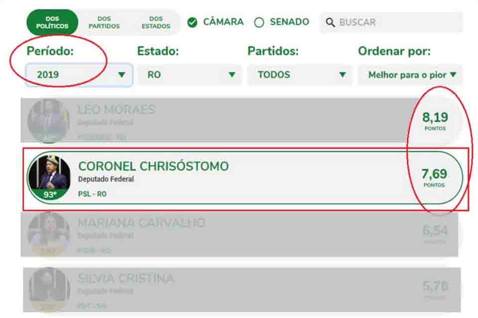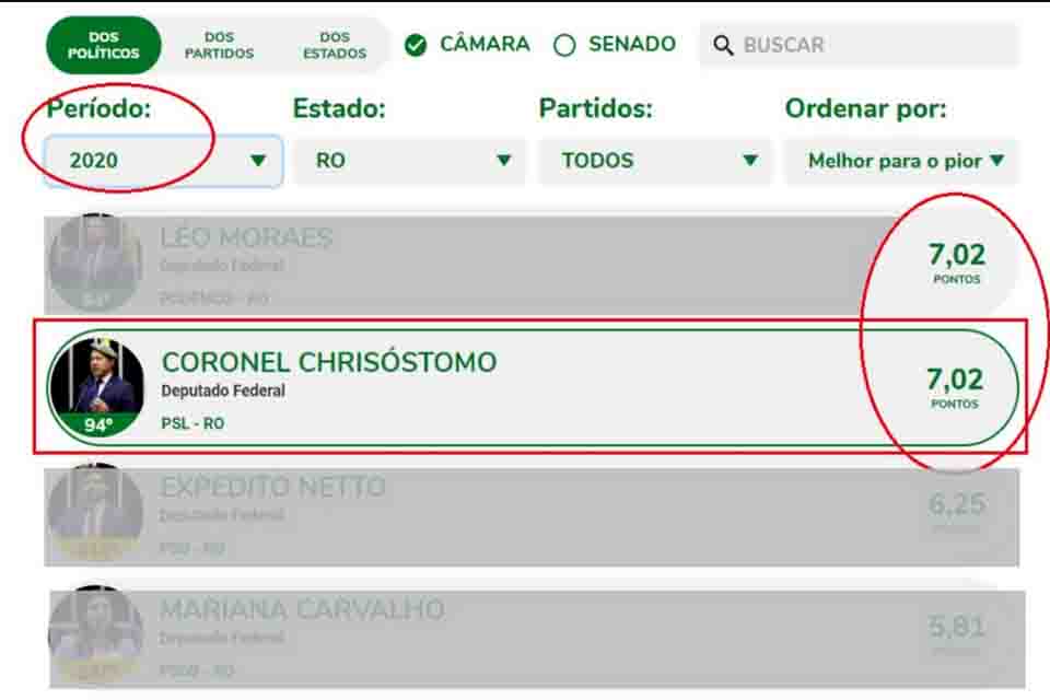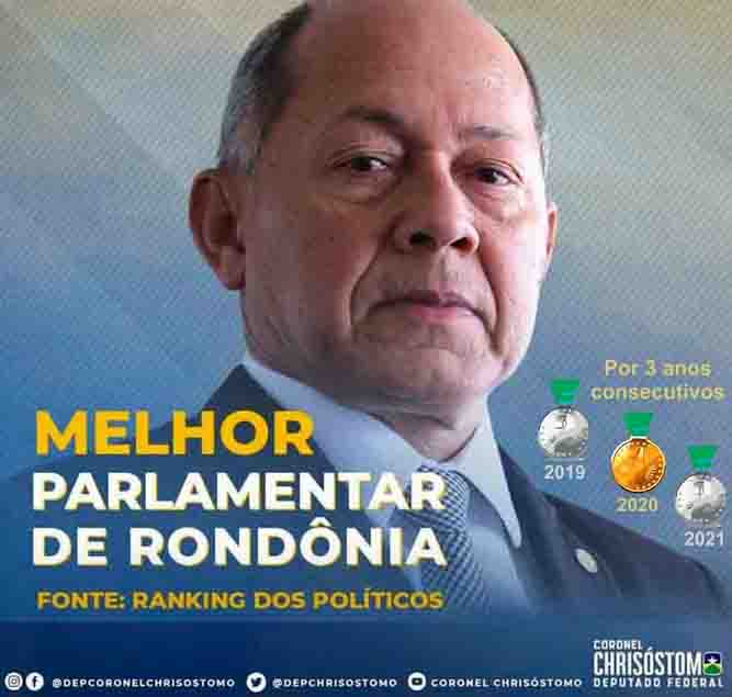 O deputado Coronel Chrisóstomo (PSL-RO) foi o parlamentar rondoniense eleito em Segundo lugar no seu primeiro ano de mandato (2019), deixando para trás pares veteranos na política do estado, assim se manteve e no ano de 2020 alcançou o topo da premiação levando também o primeiro lugar na Classificação do Ranking.