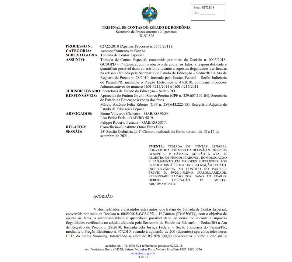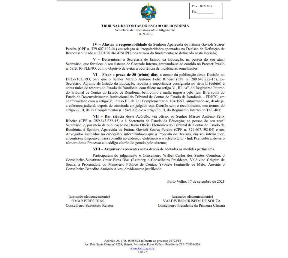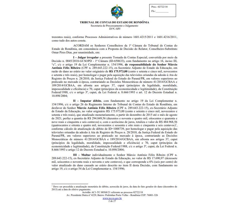 Porto Velho, RO – O Tribunal de Contas do Estado de Rondônia (TCE/RO) julgou irregulares as contas do ex-secretário adjunto de Educação (Seduc/RO) Márcio Antônio Félix Ribeiro.