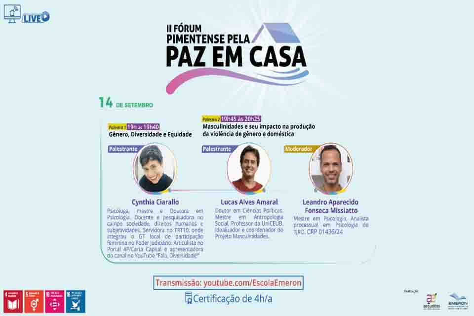 Este ano, o fórum acontece de forma virtual em dois dias, com transmissão ao vivo. No primeiro dia (14), o evento conta com duas palestras sob a mediação do Psicólogo do Tribunal de Justiça de Rondônia, Leandro Aparecido Fonseca Missiattto. A primeira, ministrada pela doutora em psicologia, servidora do TRT10 e pesquisadora no campo sociedade, direitos humanos e subjetividades Cynthia Ciarallo, abordará o tema “Gênero, Diversidade e Equidade”. Em seguida, o doutor em Ciências Políticas, docente universitário e pesquisador das interfaces entre Psicologia, Ciências Sociais e Direitos Humanos, com foco nos estudos das masculinidades Lucas Alves Amaral discorrerá sobre “Masculinidades e seu impacto na produção da violência de gênero e doméstica”.