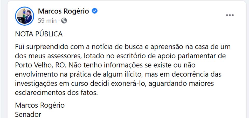 Fui surpreendido com a notícia de busca e apreensão na casa de um dos meus assessores, lotado no escritório de apoio parlamentar de Porto Velho, RO. Não tenho informações se existe ou não envolvimento na prática de algum ilícito, mas em decorrência das investigações em curso decidi exonerá-lo, aguardando maiores esclarecimentos dos fatos.