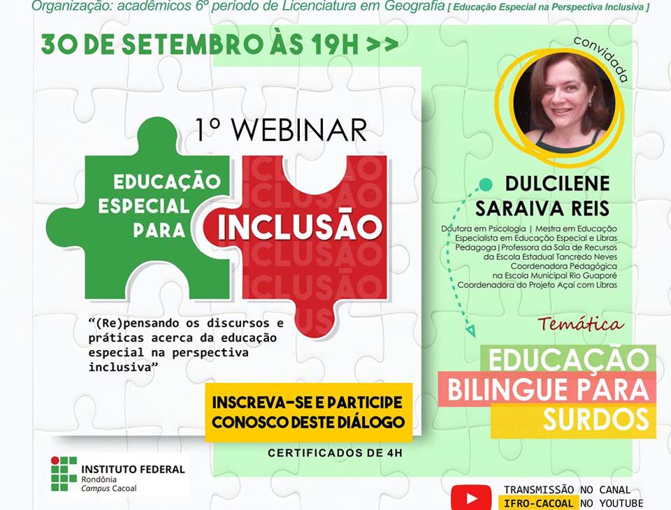 Para receber certificação é necessária a inscrição através do formulário https://forms.gle/gXdPZziU2EssC7PZ8. O Webinar acontecerá dia 30 de setembro, às 19 horas, pelo canal do IFRO Campus Cacoal no YouTube, com transmissão ao vivo.