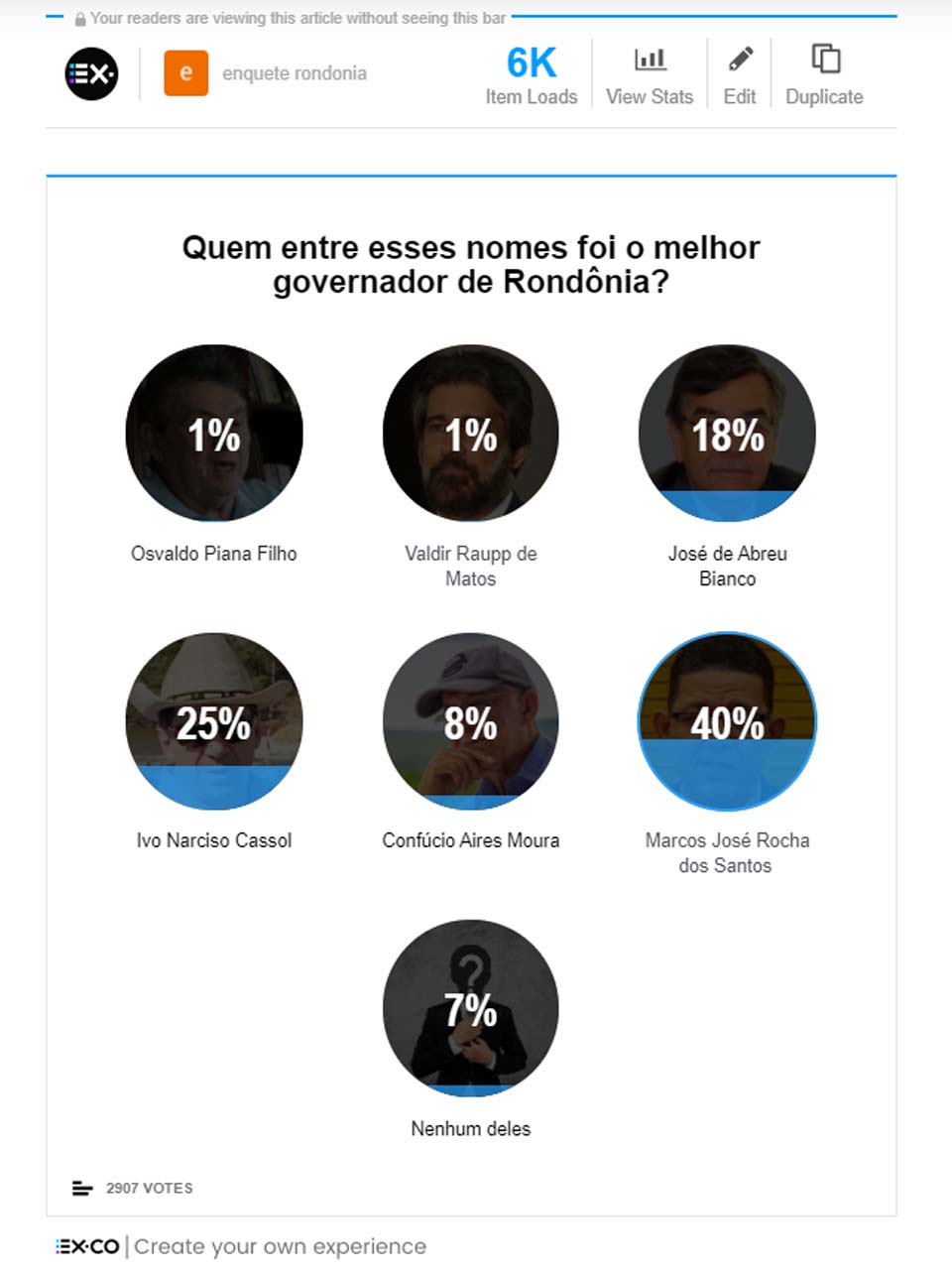 Porto Velho, RO – Na última sexta-feira (03), o jornal eletrônico Rondônia Dinâmica lançou enquete para saber dos seus leitores e leitoras quem dentre seis nomes seria o melhor governador de Rondônia.