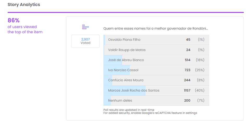 A primeira opção com mais votos foi o atual governador Coronel Marcos Rocha, com 40% do total, perfazendo 1.157 votos; logo em seguida vem Ivo Cassol, com 25% (723 votos); e José Bianco em terceiro, com 18% (514 votos).