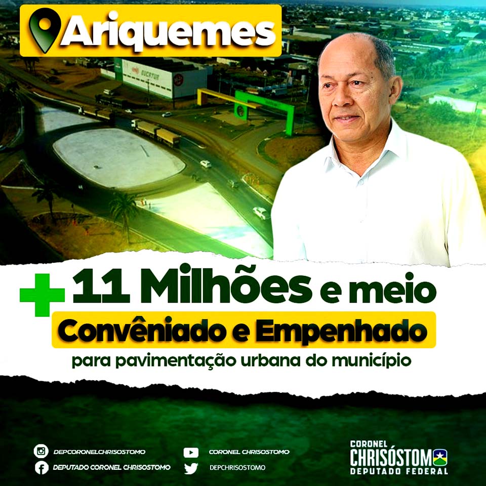 Ariquemes;RO - O Deputado Federal por Rondônia, Coronel Chrisóstomo destinou, por meio de emendas parlamantares de sua autoria, mais de R$ 11 milhões para a pavimentação urbana no município de Ariquemes. O anúncio da aplicação do recurso foi feito durante está semana e, de acordo com o deputado, o valor de R$ 11.585.971,00, estará o disponível na conta da prefeitura em breve, para que o executivo municipal dê continuidade as obras de asfaltamento da cidade, melhorando a infraestrutura e proporcionado uma melhor qualidade de vida para a população ariquemense.