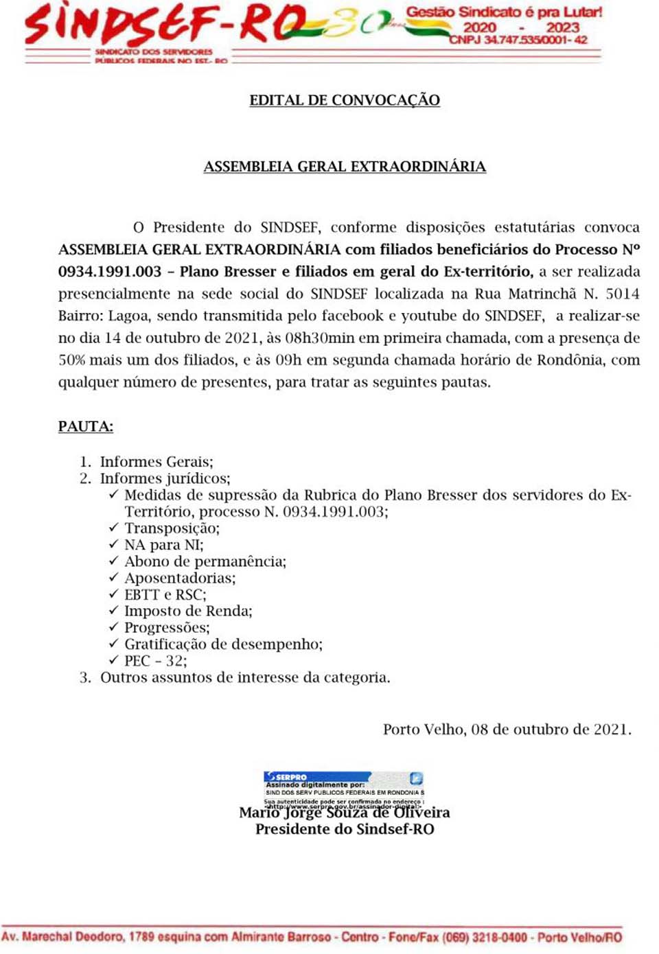 Edital de Assembleia Geral Extraordinária com os beneficiários do Plano Bresser e filiados do Ex-Território
