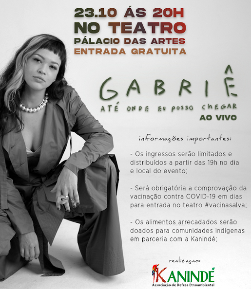 Fazendo jus aos posicionamentos artísticos e sociais, Gabriê explica que o show será aberto ao público, mediante a doação de alimentos não perecíveis, respeitando a capacidade máxima do teatro, levando em consideração a realidade atual da pandemia. “Acredito que o acesso à arte deve ser democrático e eu quero ter a possibilidade de chegar em todas as pessoas, em todos os locais, e tocá-las de alguma forma com algo que foi criado e inspirado aqui, fruto da nossa terra, da nossa cultura. O atual momento ainda pede restrições e cuidados, mas tornar esse espaço do teatro e meu show acessível de alguma forma para a nossa gente me enche de alegria”, finaliza.