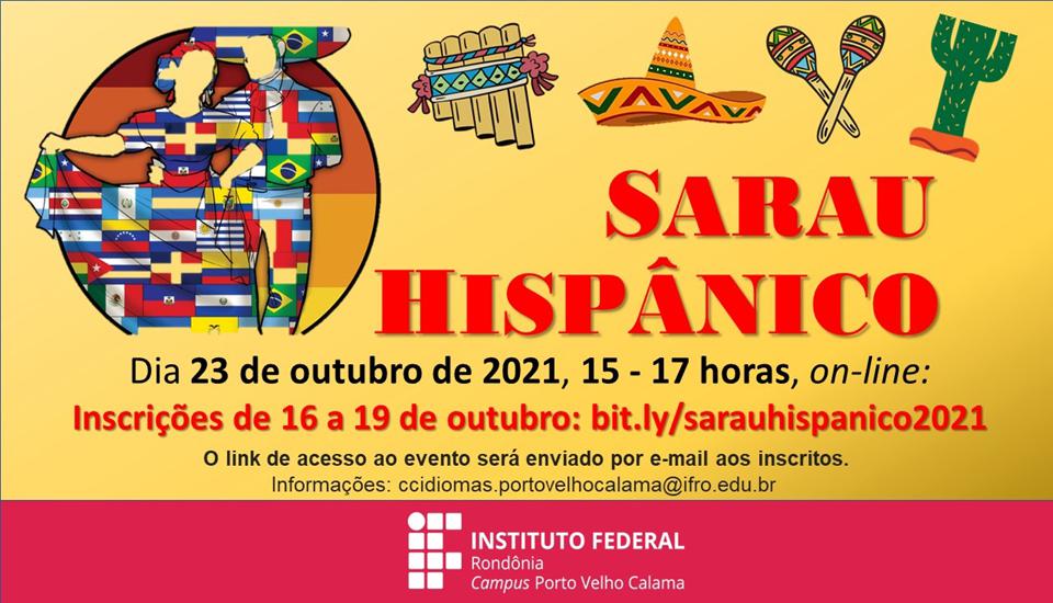 O Sarau Hispânico será realizado no sábado, 23 de outubro, das 15 às 17 horas, pela plataforma Webex, cujo link de acesso ao evento será enviado por e-mail aos inscritos. O evento, que é promovido anualmente desde 2012 pelo Campus Porto Velho Calama do Instituto Federal de Educação, Ciência e Tecnologia de Rondônia – IFRO, terá sua segunda edição on-line devido à pandemia de Covid-19.