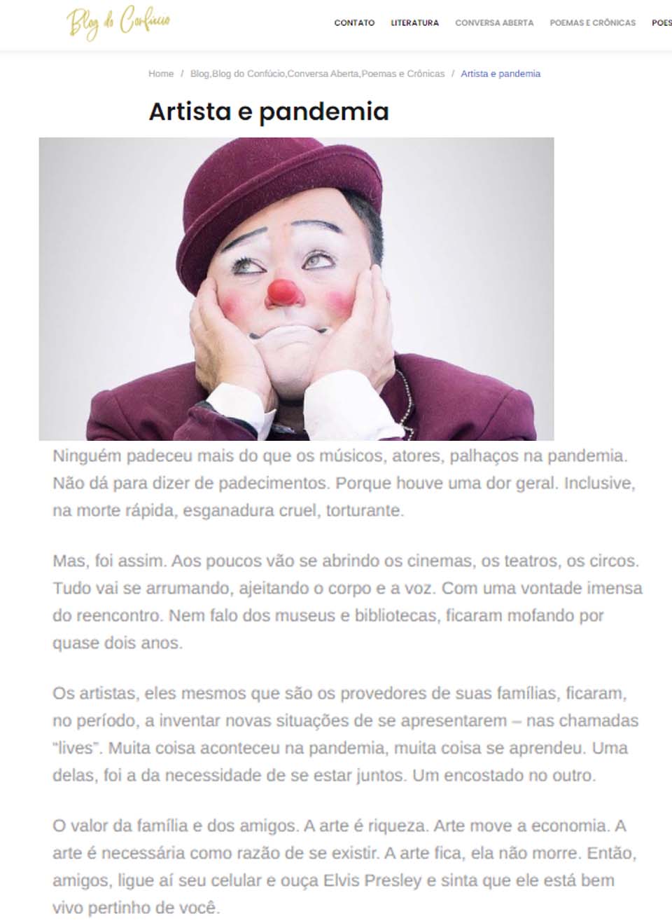 “Mas, foi assim. Aos poucos vão se abrindo os cinemas, os teatros, os circos. Tudo vai se arrumando, ajeitando o corpo e a voz. Com uma vontade imensa do reencontro. Nem falo dos museus e bibliotecas, ficaram mofando por quase dois anos.”, concluiu.
