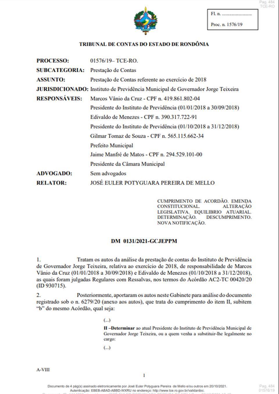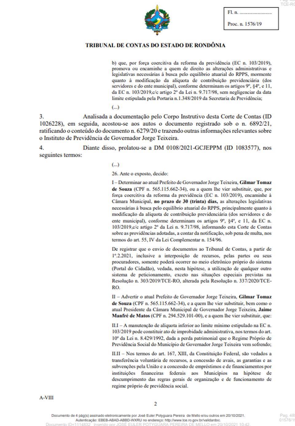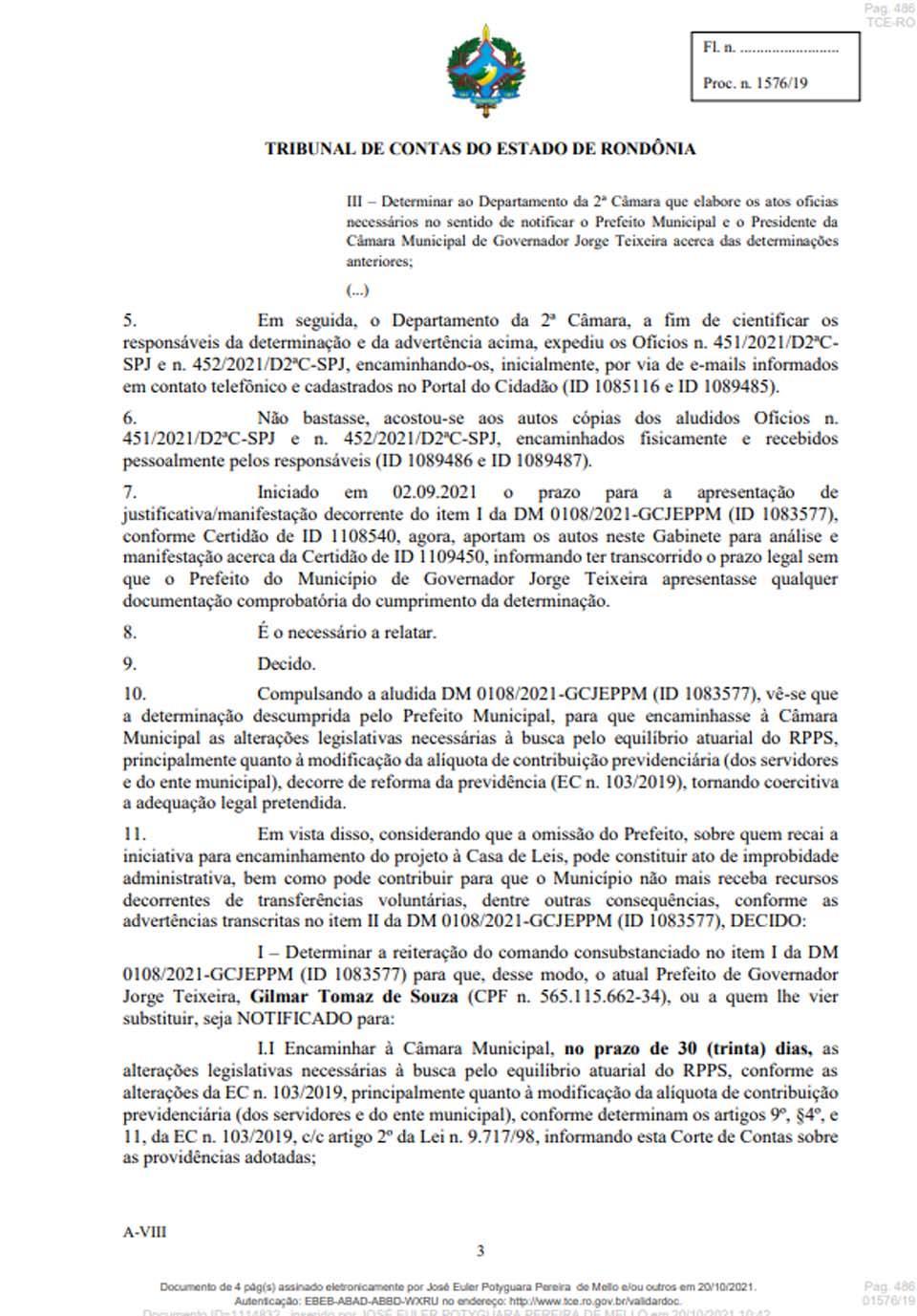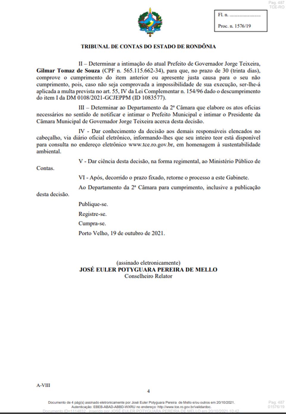 Porto Velho, RO – O conselheiro José Euler Potyguara Pereira de Mello reiterou decisão anterior da Corte de Contas e acionou o prefeito de Governador Jorge Teixeira Gilmar Tomaz de Souza.