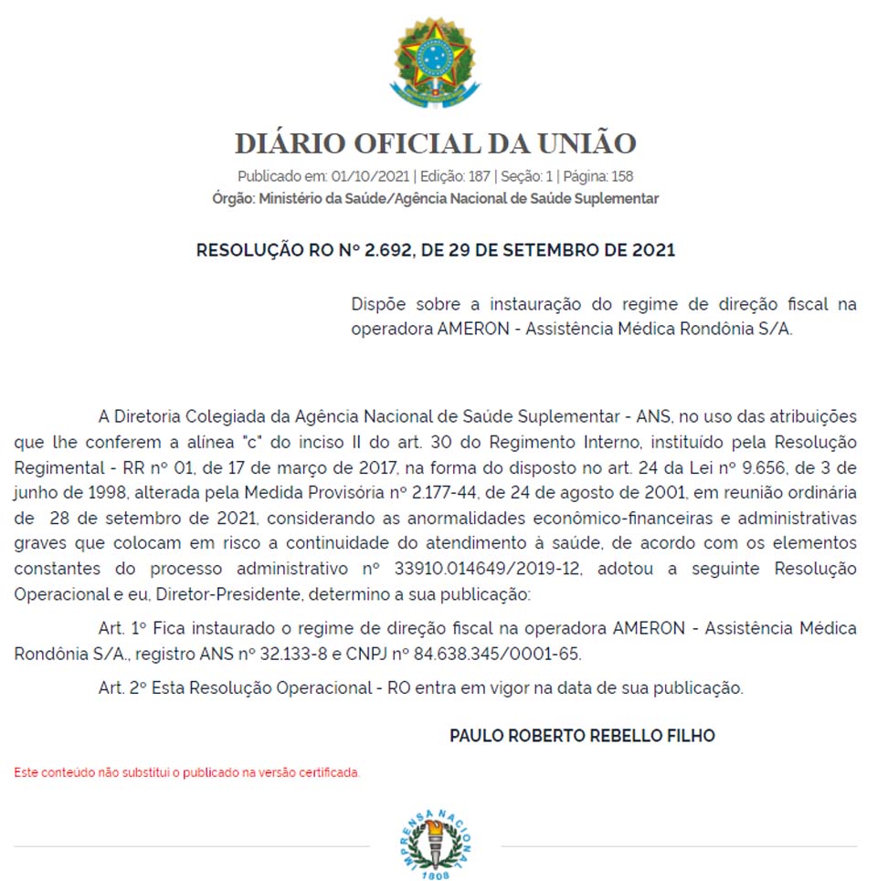 “Art. 1º Fica instaurado o regime de direção fiscal na operadora AMERON - Assistência Médica Rondônia S/A., registro ANS nº 32.133-8 e CNPJ nº 84.638.345/0001-65”.