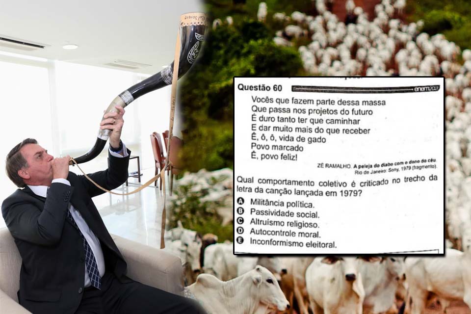 O presidente Jair Bolsonaro disse que não interveio nas questões do Enem/2021. Nem ele nem o seu ministro da Educação e nem nenhum outro funcionário do governo. Eles juraram que jamais tiveram acesso às provas. Poucas pessoas acreditaram em mais essa lorota. Óbvio que eles viram todas as questões, a prova maior é que o mesmo disse que “agora o Enem tem a cara do governo”. Porém, o “Bozo” e seu ministro passaram batido: talvez por não terem entendido, deixaram passar uma questão que fazia uma severa crítica ao atual governo e a todos os seus seguidores, o gado. Trata-se da música “Admirável Gado Novo” de Zé Ramalho, que faz uma crítica feroz ao comportamento do brasileiro comum que segue, anestesiado e sem questionar, tudo aquilo que os seus governantes determinam. Por isso que os eleitores do Bolsonaro são chamados de gado.
