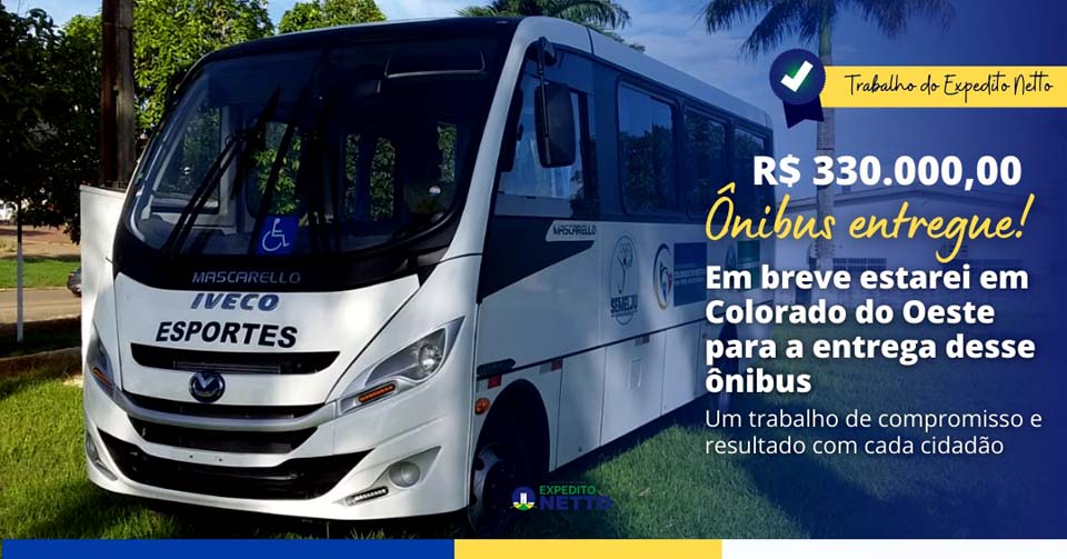 Colorado do Oeste;RO - O Deputado Federal Expedito Netto (PSD-RO), anunciou no início desta semana, a entrega de um ônibus para Secretaria Municipal de Esporte e Lazer de Colorado do Oeste. O veículo, no valor de R$ 330 mil, destinado por meio de emenda parlamentar de Expedito Netto, será utilizado pela prefeitura na prestação de serviços e melhor atendimento à população de Colorado.