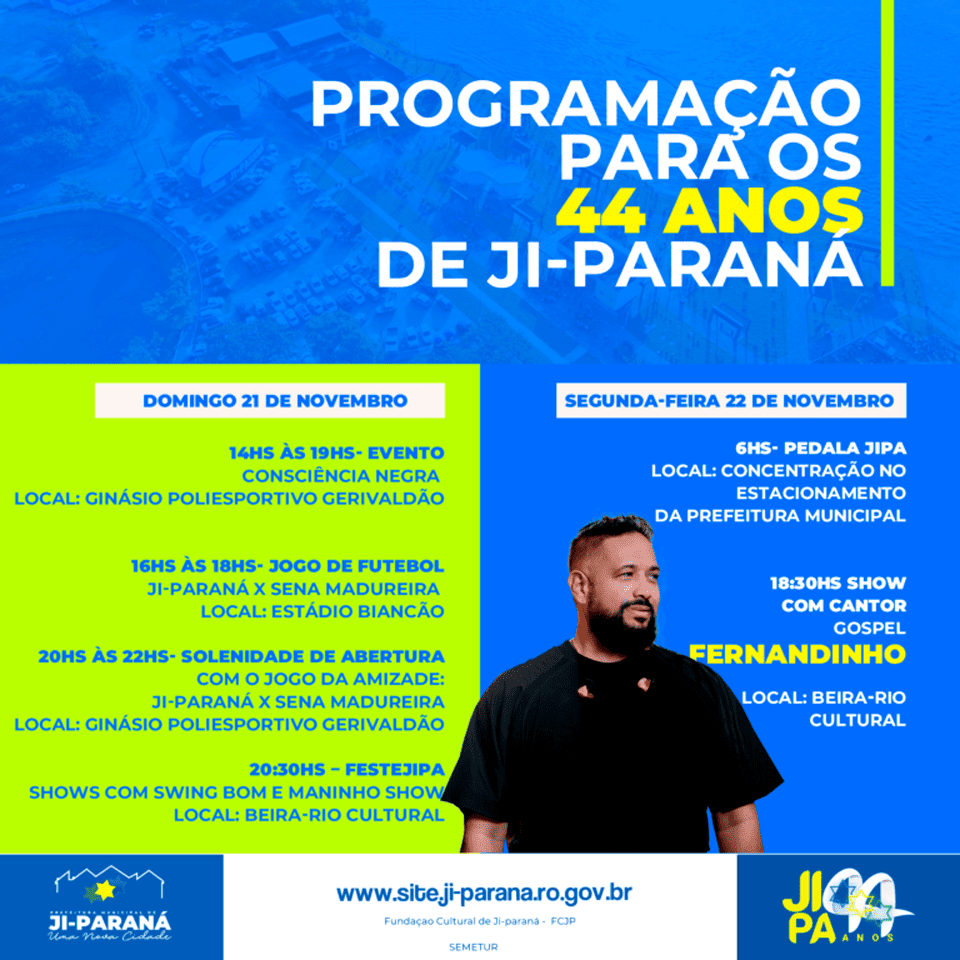 A festa dos 44 anos de emancipação político-administrativa de Ji-Paraná contará com a apresentação do cantor gospel Fernandinho como a principal atração. O show acontece na segunda-feira, 22 de novembro, a partir das 18h30, no palco do espaço Beira-Rio Cultural.