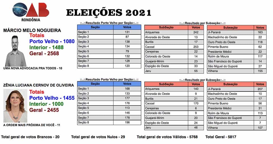A Chapa 10 "UMA NOVA ADVOCACIA PRA TODOS”, presidida pelo advogado Márcio Melo Nogueira, venceu as eleições da Ordem dos Advogados do Brasil, Seccional Rondônia (OAB/RO) nesta terça-feira (23). Márcio obteve 2.568 votos contra 2.455 votos da candidata Zênia Cernov, que liderava a chapa “A Ordem Mais Próxima de Você”.
