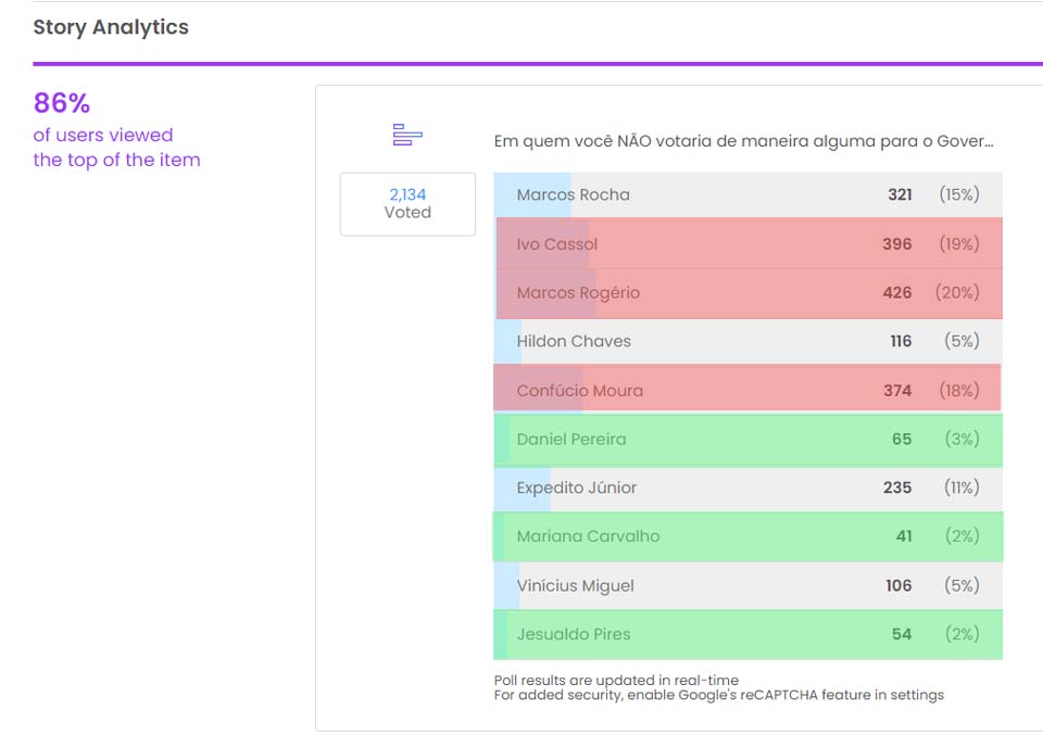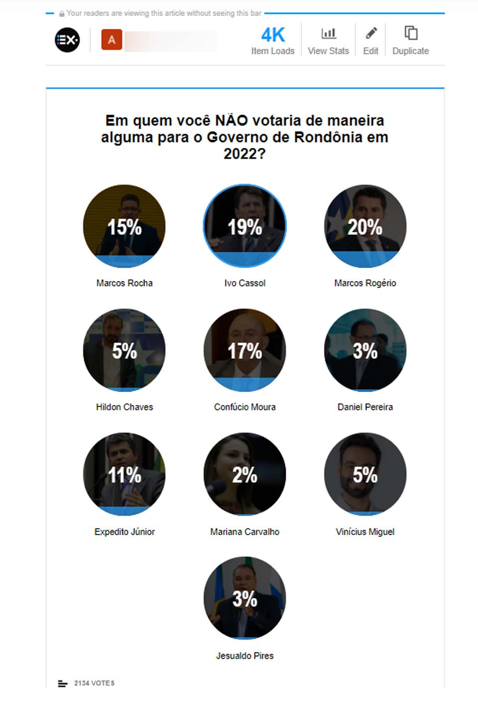 Porto Velho, RO – Na última segunda-feira (22), o jornal eletrônico Rondônia Dinâmica lançou enquete para saber dos seus leitores e leitoras quem dentre 10 nomes a audiência NÃO votaria de maneira alguma para o governo do Estado.