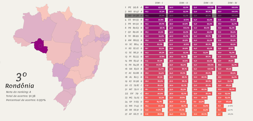 Novamente em destaque nacional, o Estado conseguiu obter 91,38 pontos, letra “A”, fazendo valer as ações desenvolvidas pelo Governo de Rondônia na questão da transparência, destacada pelo governador Marcos Rocha.