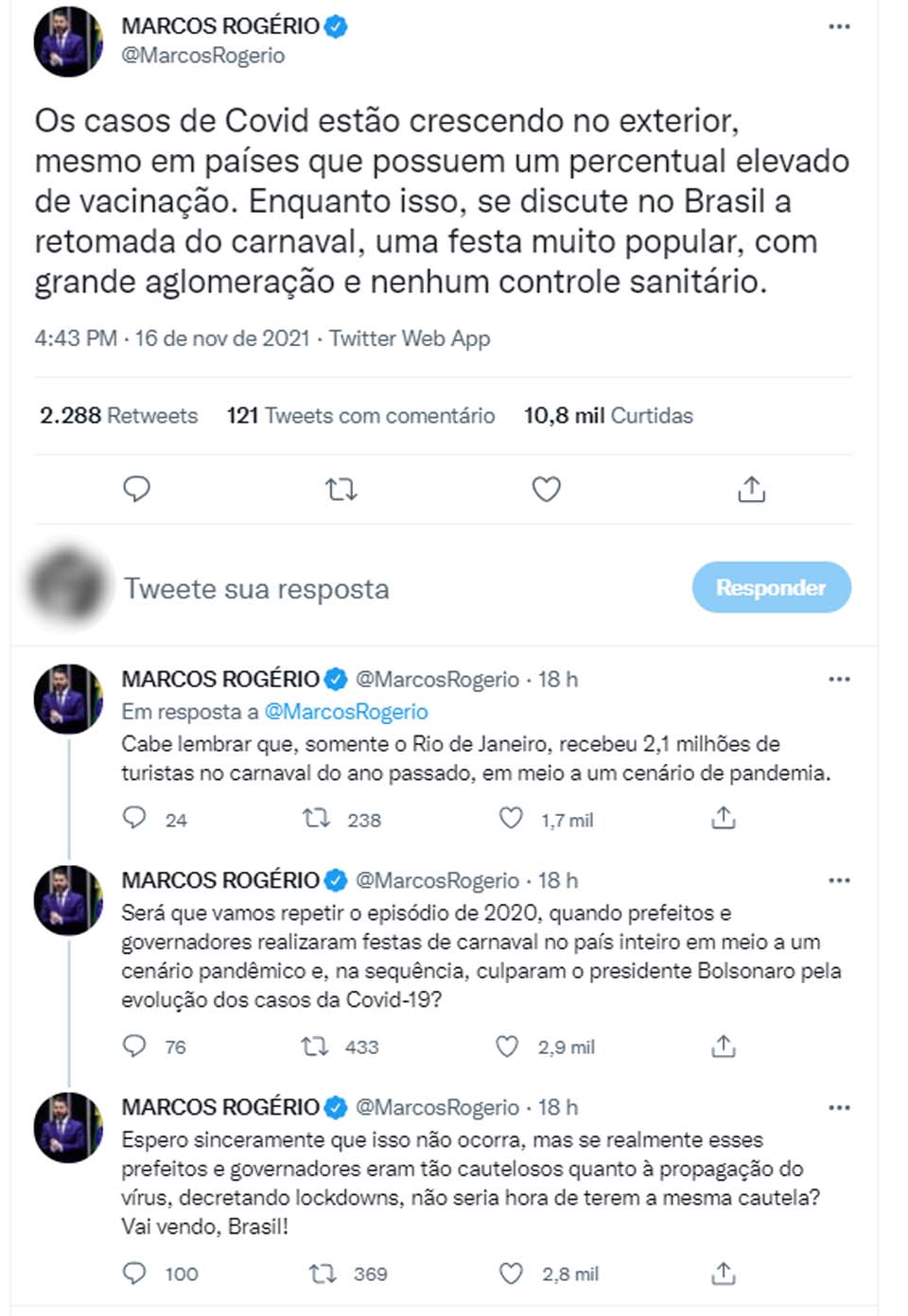 Porto Velho, RO – O senador de Rondônia Marcos Rogério, do DEM, bolsonarista, fez uma série de tweets se manifestando contra o Carnaval de 2022 por conta dos aumentos dos casos de Coronavírus (COVID-19/SARS-CoV-2) na Europa.