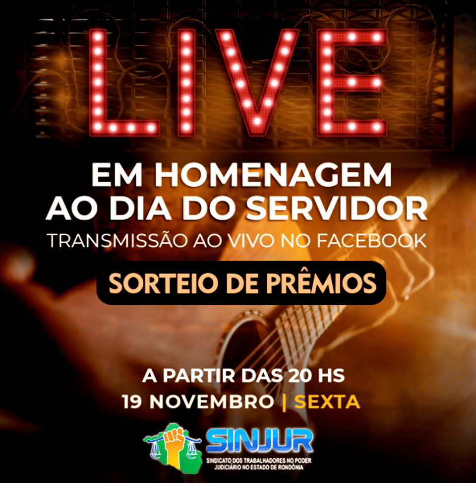 Por deliberação da diretoria do SINJUR, foi escolhido o dia 19 de novembro próximo, com início às vinte horas, para realização de uma “live”, com transmissão pelo Facebook do sinjur em comemoração ao dia do servidor público, transcorrido em 28 de outubro passado.
