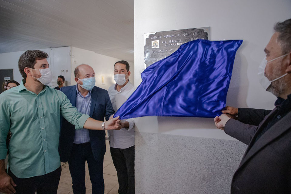 Na manhã da quinta-feira (25), a Prefeitura de Porto Velho, representada pelo vice-prefeito Maurício Carvalho, esteve no ato solene da descerramento de placa que dará nome à área destinada aos gabinetes de vereadores, na Câmara Municipal, em homenagem ao ex-vereador Edésio Fernandes.
