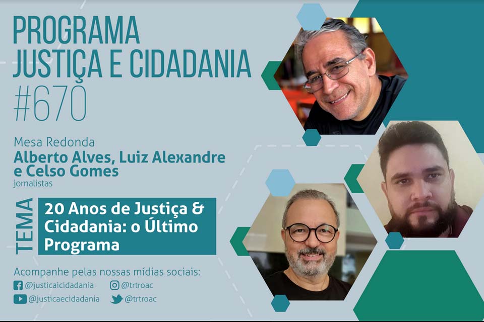 Com um histórico de 20 anos, o Programa Justiça & Cidadania, produzido pela Secretaria de Comunicação Social e Eventos Institucionais do Tribunal Regional do Trabalho da 14ª Região, cumpre o seu papel e tem sua produção encerrada com o programa n. 670.