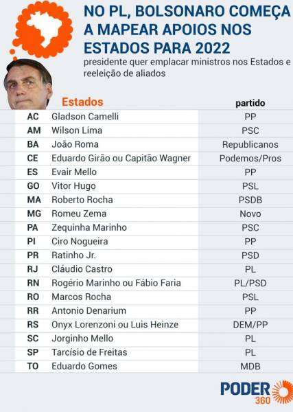 CONFIRA NA IMAGEM SECUNDÁRIA a lista de alguns nomes que têm a simpatia de Bolsonaro para se candidatarem ao Senado e aos Executivos locais.