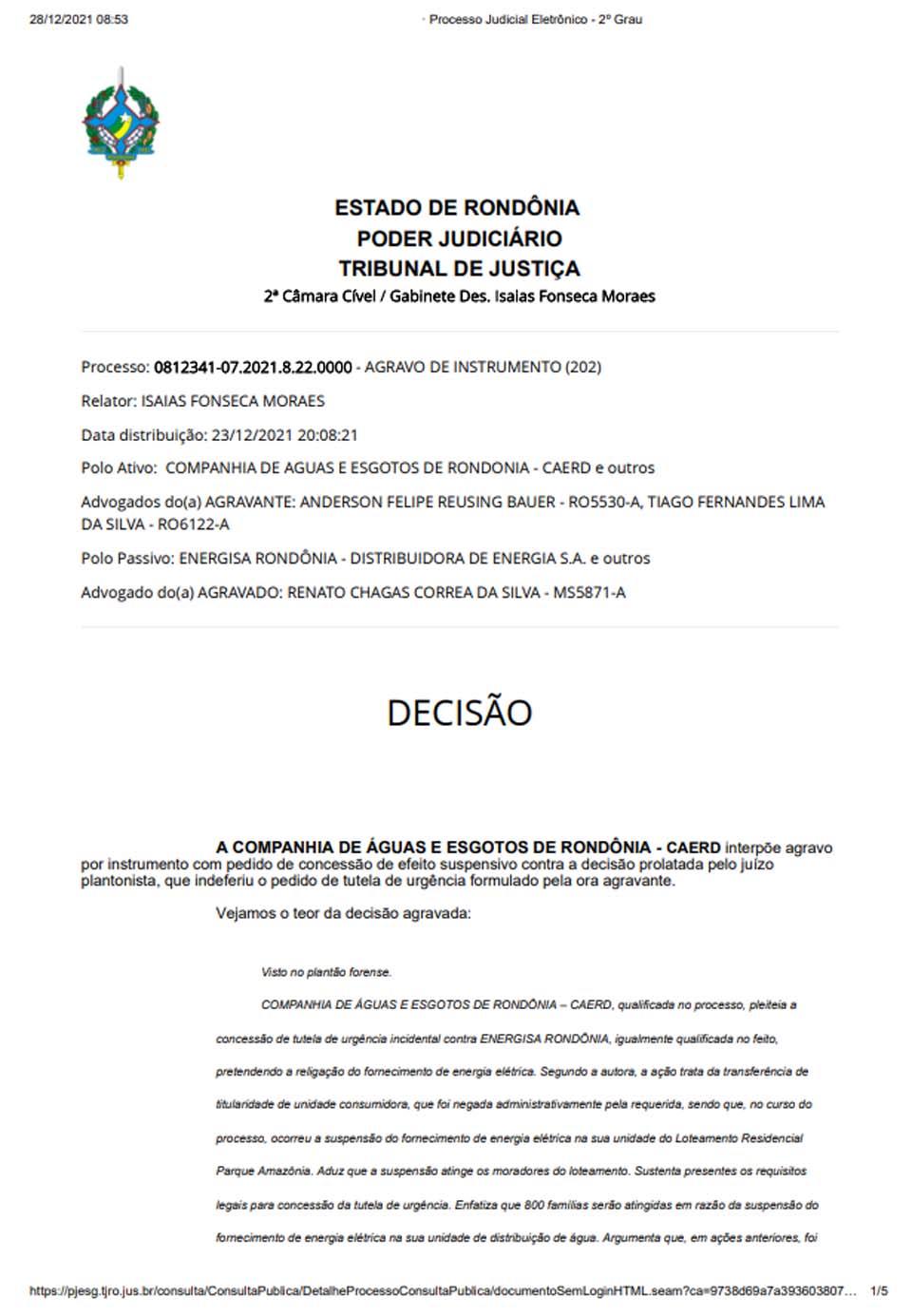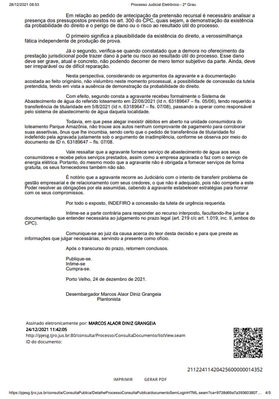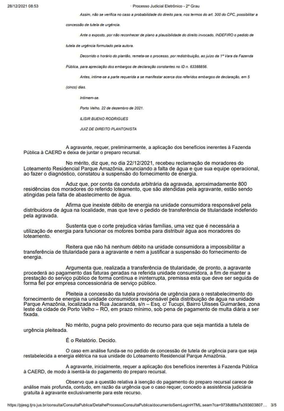 O juiz de Direito plantonista Ilisir Bueno Rodrigues, da 3ª Vara Cível de Porto Velho, decidiu a respeito do pleito ideferindo a demanda, ou seja, rechaçando a concessão de tutela antecipada pleiteada pela Caerd.