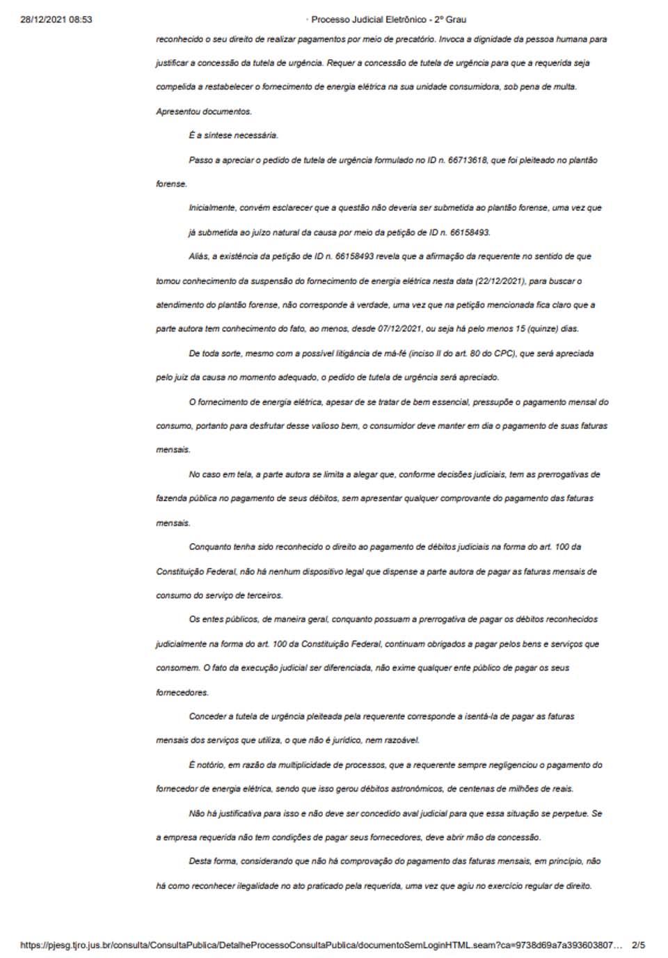 A análise do recurso foi feita pelo desembargador plantonista da 2ª Câmara Cível do Tribunal de Justiça (TJ/RO) Marcos Alaor Diniz Grangeia.