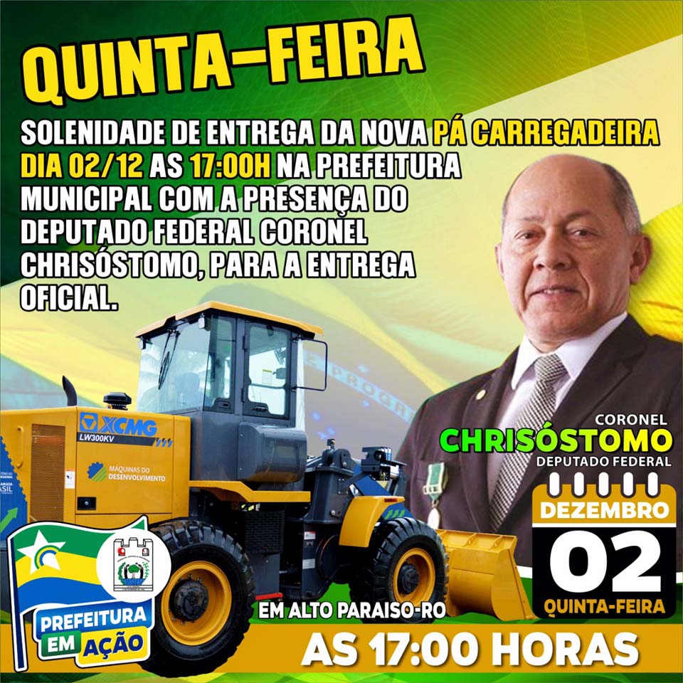 Alto Paraíso;RO - O Deputado Federal por Rondônia, Coronel Chrisóstomo irá realizar na próxima quinta-feira (2), a entrega de um veículo pá carregadeira para ações de infraestrutura da prefeitura do município de Alto Paraíso. O equipamento novo é fruto de emenda de autoria do parlamentar, que durante o seu mandato, vem destinado recursos que estão beneficiando o desenvolvimento de vários munícípios do Estado.