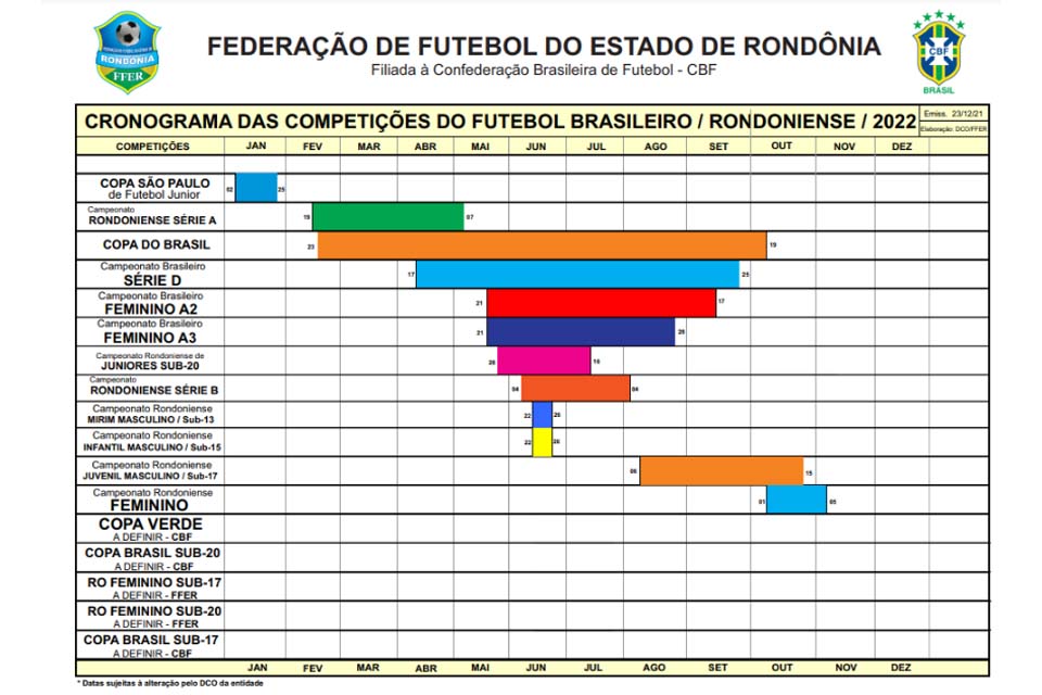 A Federação de Futebol do Estado de Rondônia (FFER) publicou nesta quarta-feira (29/12) o calendário do futebol rondoniense para a temporada 2022.