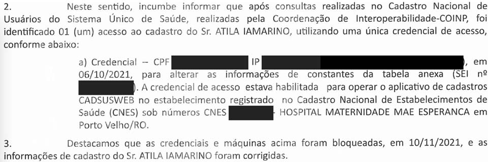 "Cabe esclarecer que as credenciais do operador responsável são bloqueadas sempre que uma irregularidade é identificada e os dados das vítimas são prontamente corrigidos e atualizados", destacou a pasta, orientando ainda que as pessoas entrem em contato com o número 136 para pedir correção de qualquer dado no ConecteSUS.